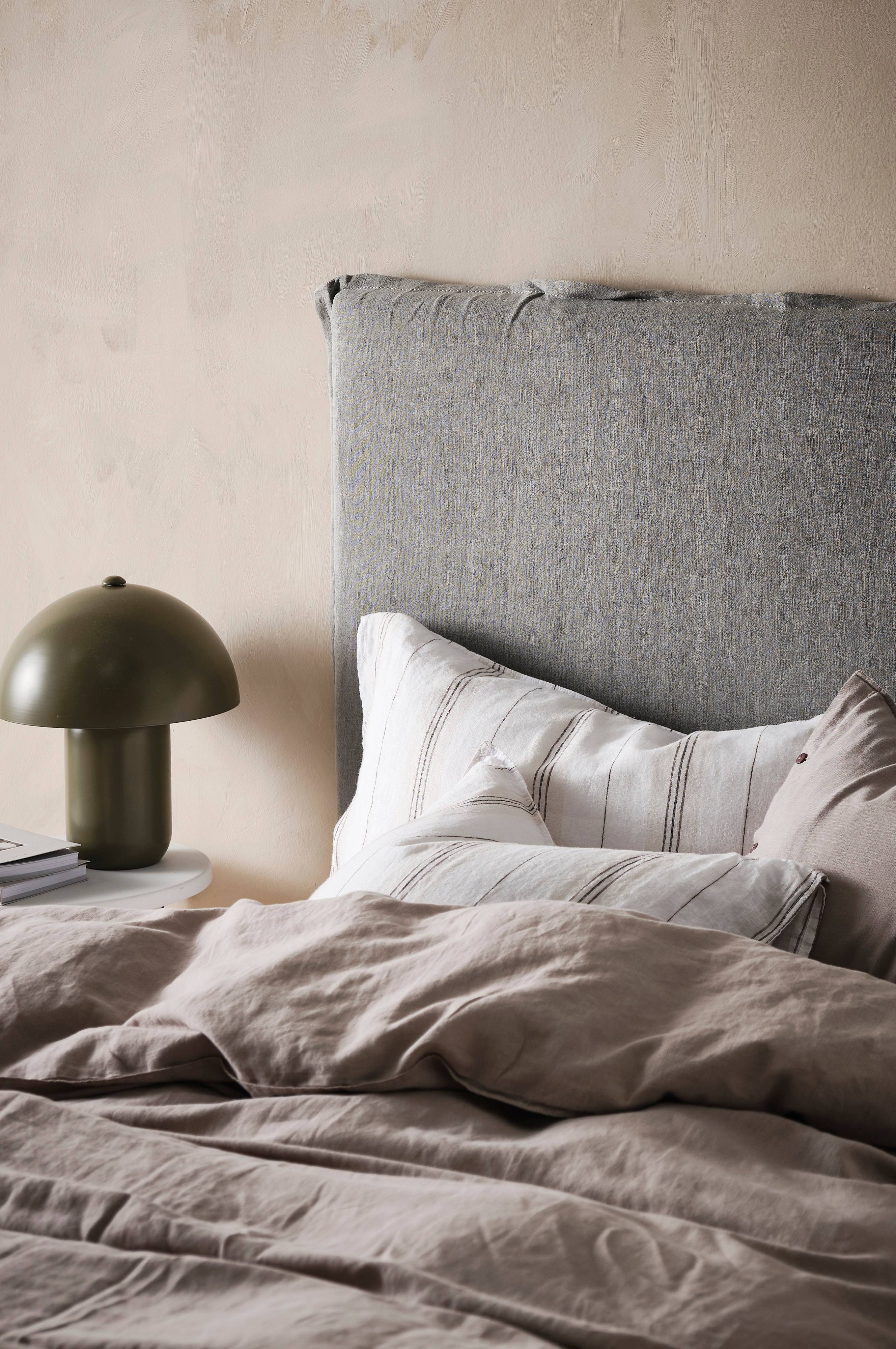 Fritstående gavl med aftageligt hørbetræk og fyld af skumgummi. Skab et afslappet look med en sengegavl med aftageligt hørbetræk.