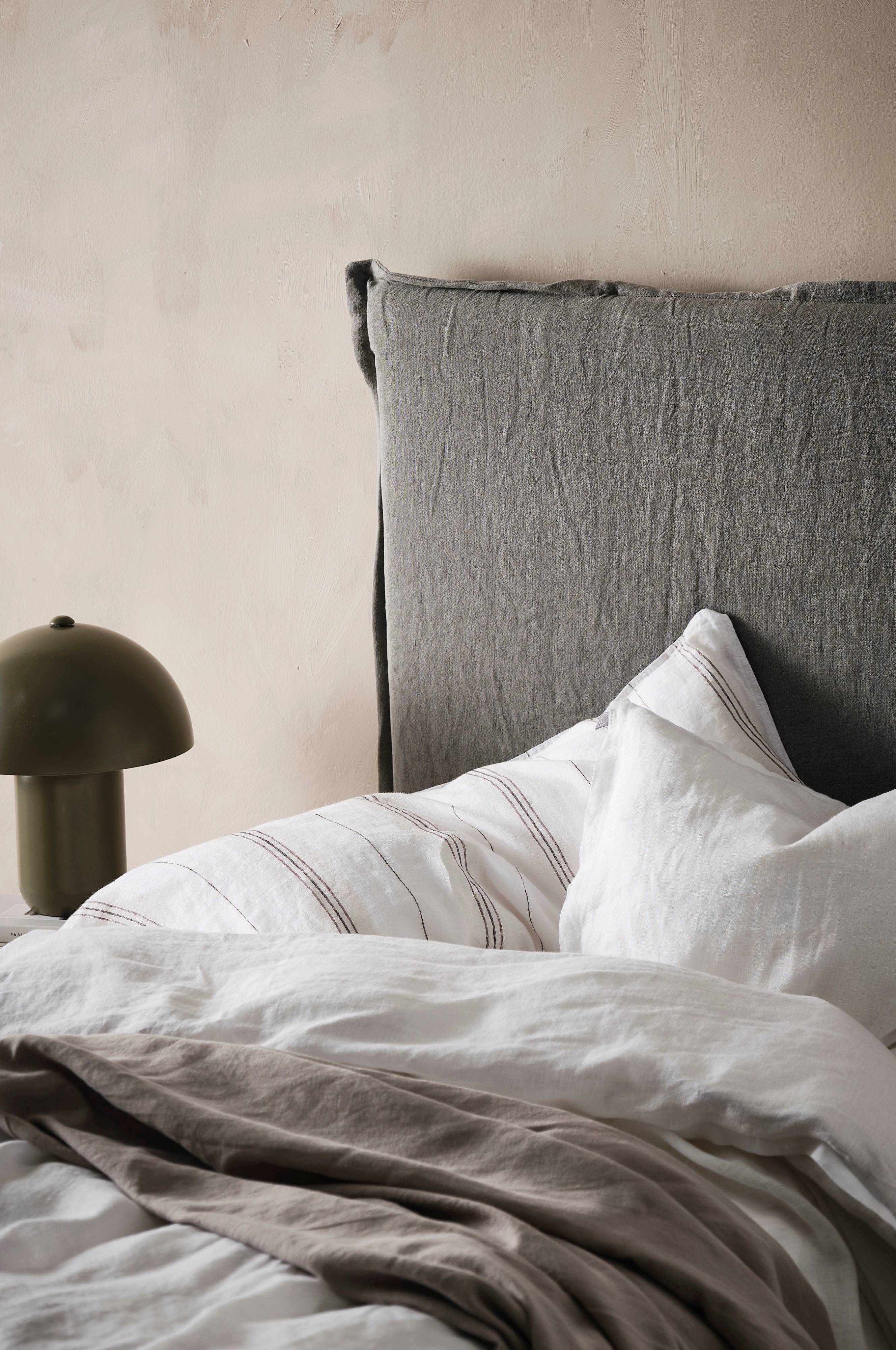 Fritstående gavl med aftageligt hørbetræk og fyld af skumgummi. Skab et afslappet look med en sengegavl med aftageligt hørbetræk.