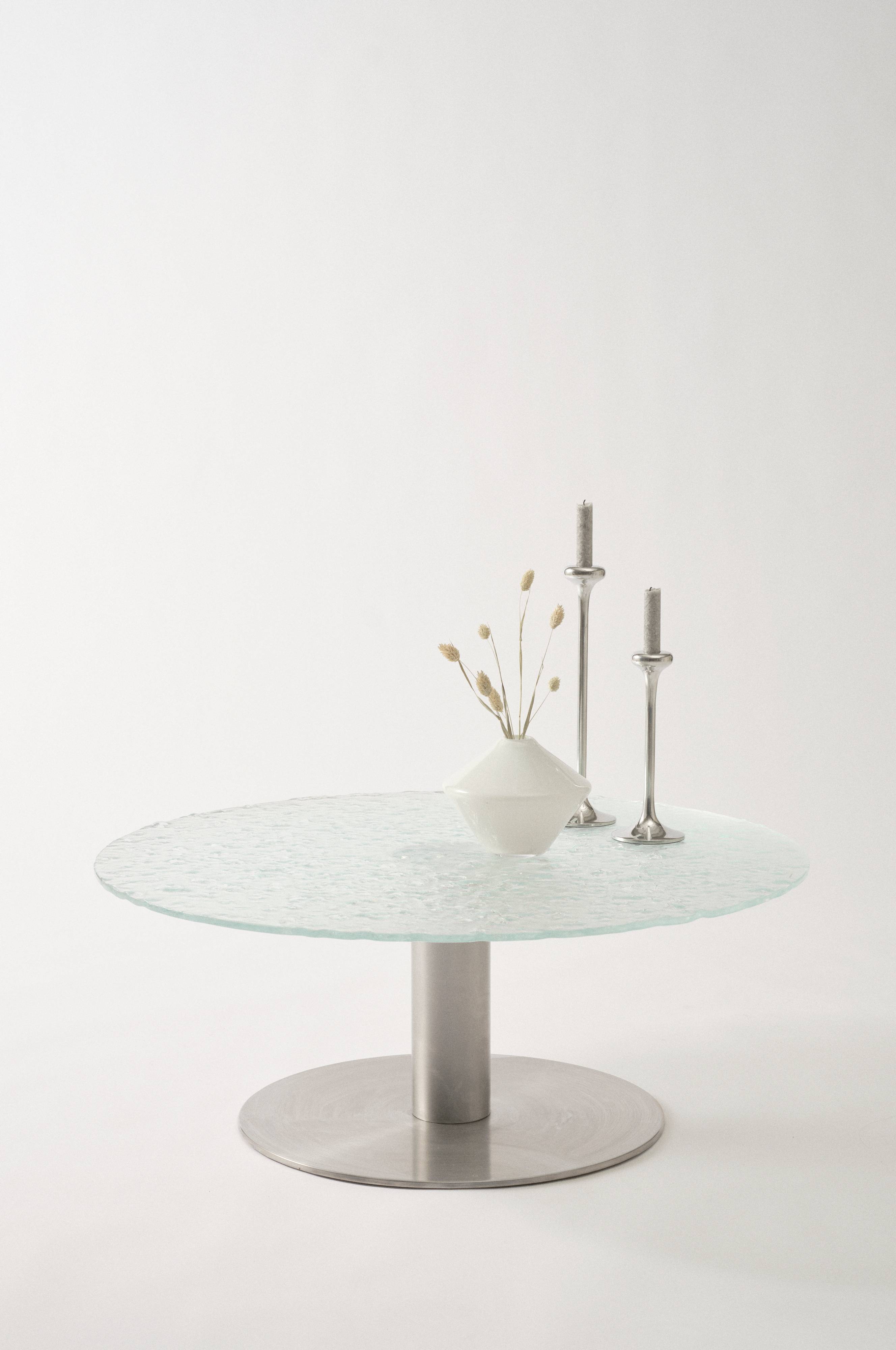 Rundt spisebord med bordplade i boblet glas og søjlefod af rustfrit stål med børstet overflade. Foden er lige og stilren og skaber flot kontrast til bordpladen i boblet glas. Den lave højden på bordet giver skøn loungefornemmelse ved sofaen. Skal færdigsamles. Samlevejledning medfølger.