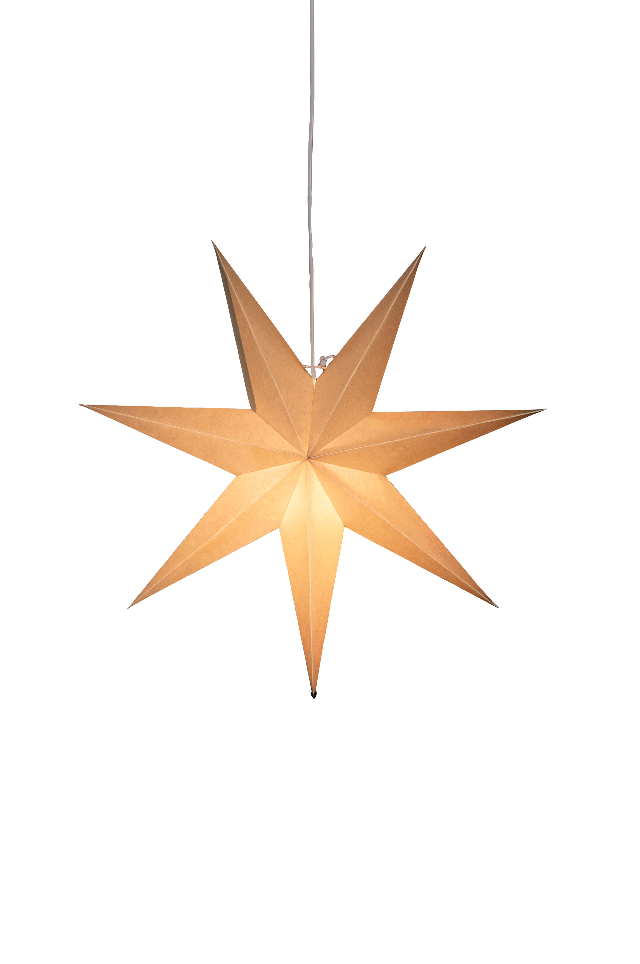 Hængende papirstjerne med 7 takker. Ledningssæt med 5 meter tilslutningsledning medfølger, E14-fatning. Afbryder på ledning. Diameter 60 cm