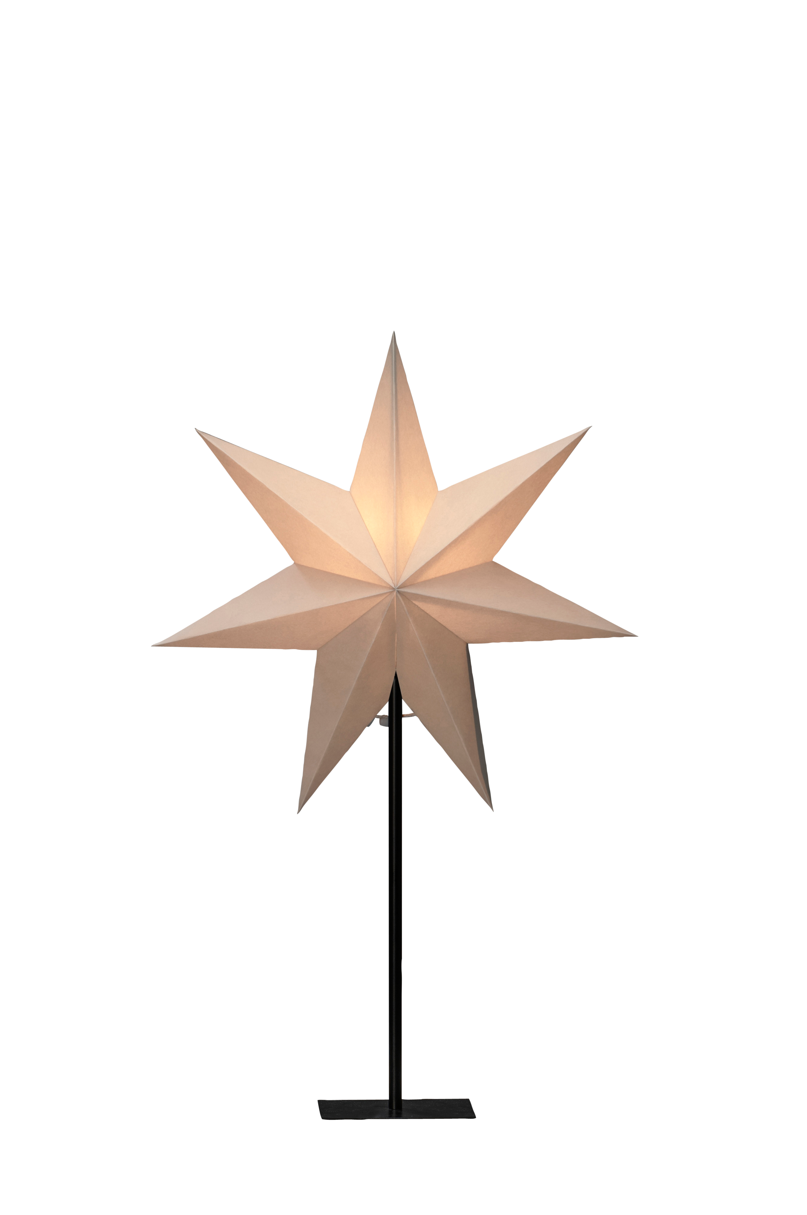 Papirstjerne med 7 spidser på sort metalfod. Tilslutningsledning på 2,4 meter med strømafbryder. E14-sokkel, pære medfølger ikke. Diameter 40 cm, højde 65 cm.