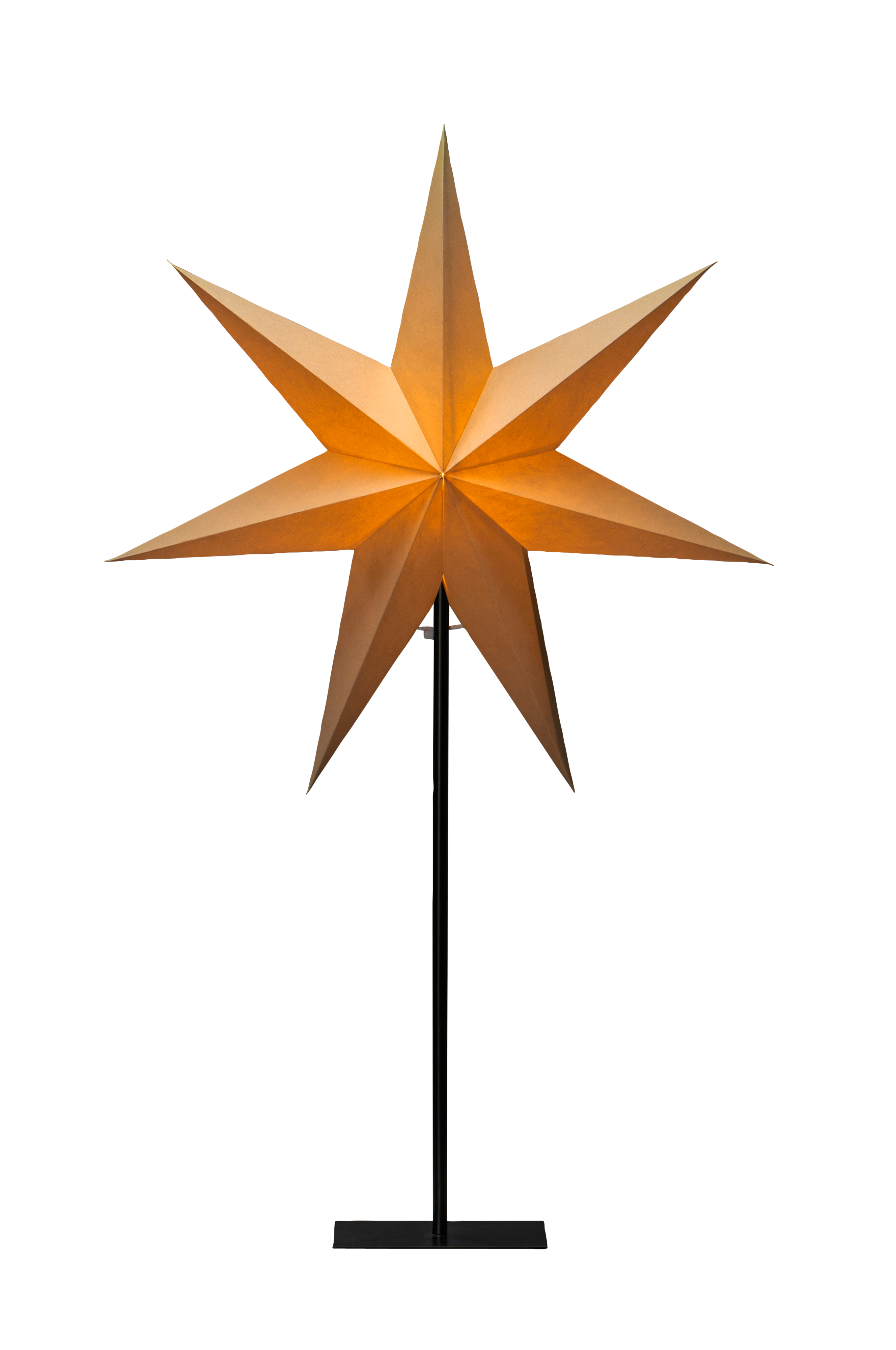 Papirstjerne med 7 spidser på metalfod. Tilslutningsledning på 2,4 meter med strømafbryder. E14-sokkel, pære medfølger ikke. Diameter 50 cm, højde 80 cm.