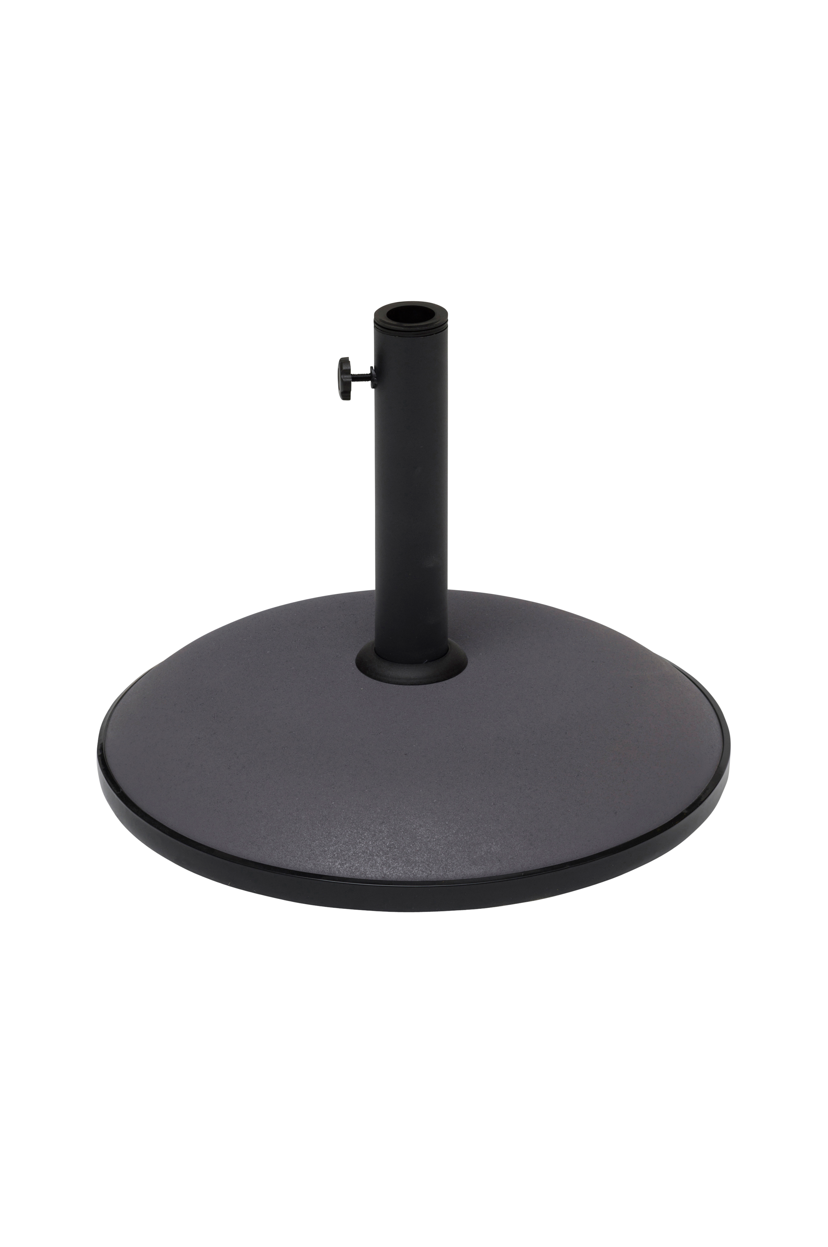 Parasolfod i grå beton. Plasthylstre i røret gør det muligt at justere diameteren mellem 30 og 40 mm. Plastlisten gør at betonfoden kan flyttes med mindre risiko for ridser.