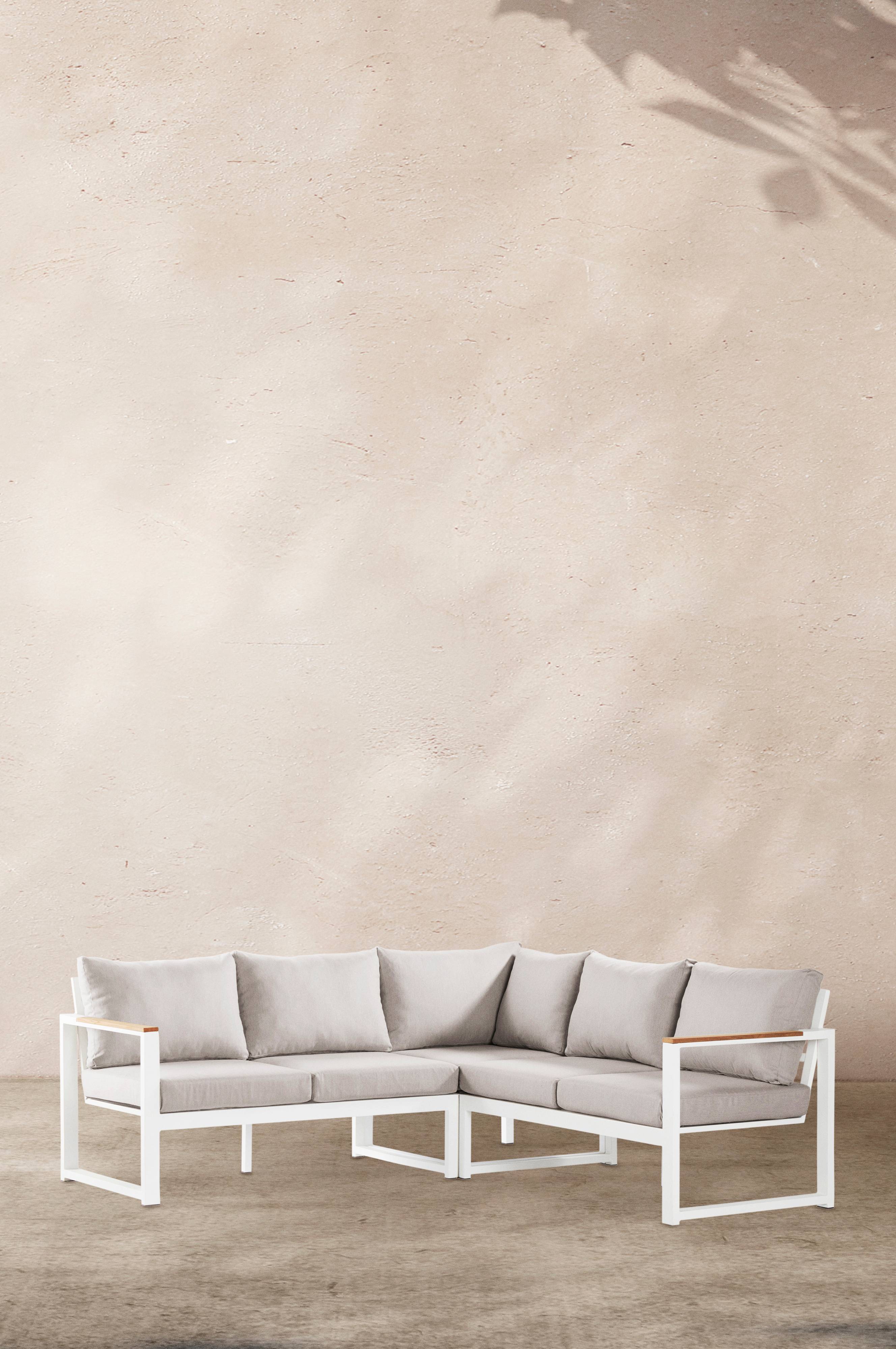 Loungesofa i tre dele med armlæn af teaktræ og stel af pulverlakeret aluminium. Du sidder skønt på blødt polstrede hynder og behagelige rygpuder. Gruppen består af tre dele, som du kan placere som du vil, sammen eller hver for sig. Aluminium er et praktisk materiale som har lav vægt og ikke ruster. Du kan lade det stå udendørs. Skal færdigsamles.