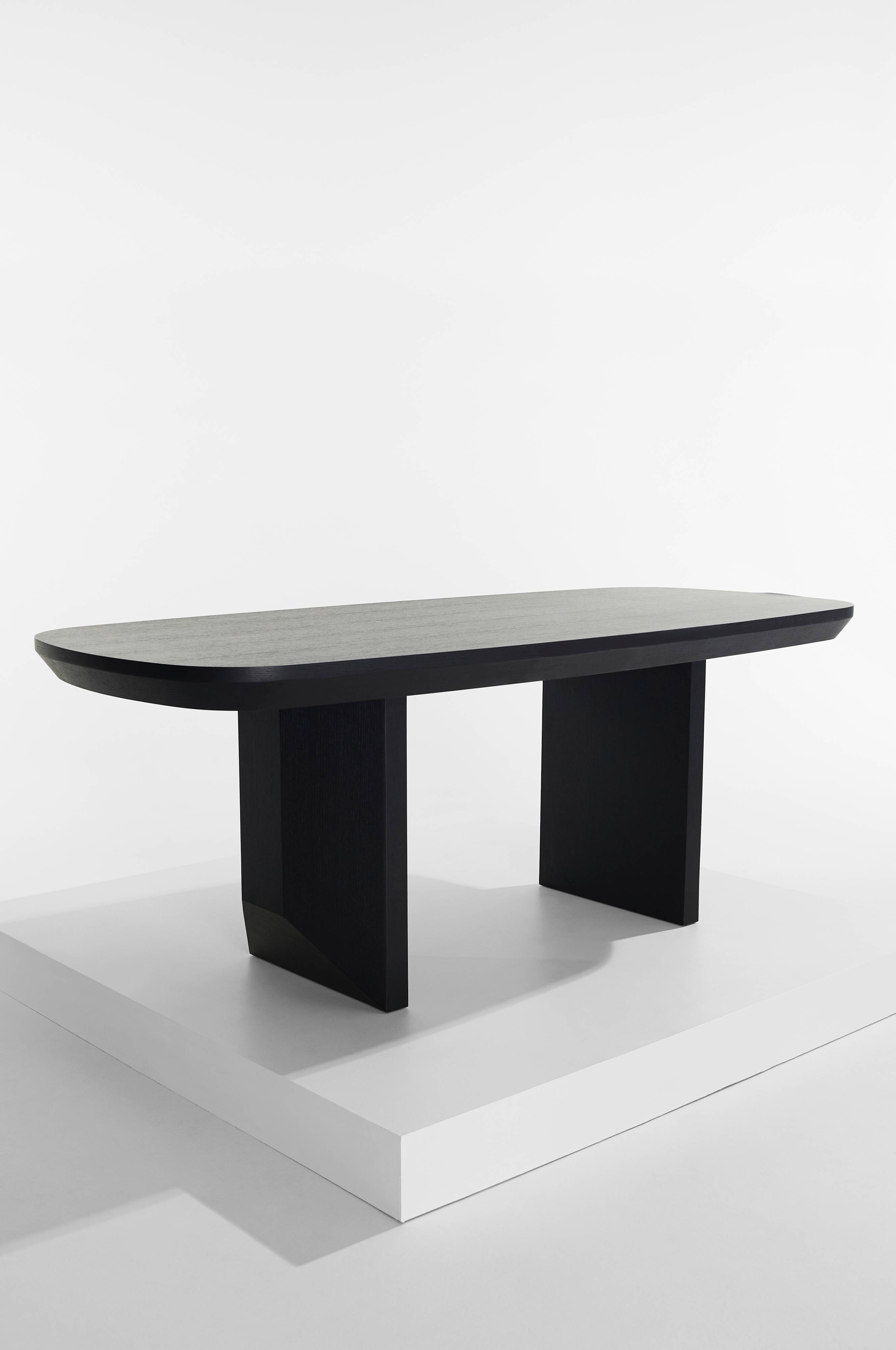 Corinne er et kraftigt, praktisk og utroligt flot spisebord, som er lavet til at samle mange venner rundt om. De velplacerede ben gør det nemt at siddet rundt om hele bordet. Den store bordplade har en flot, falset kant under, og benene, et bræt i hver ende, matcher falsningen. Stellet er af MDF med elegant, sortmalet egefinér. Materialet i bordet er FSC-mærket. Bordet leveres usamlet. Skruer og samlevejledning for at skrue benene fast medfølger.