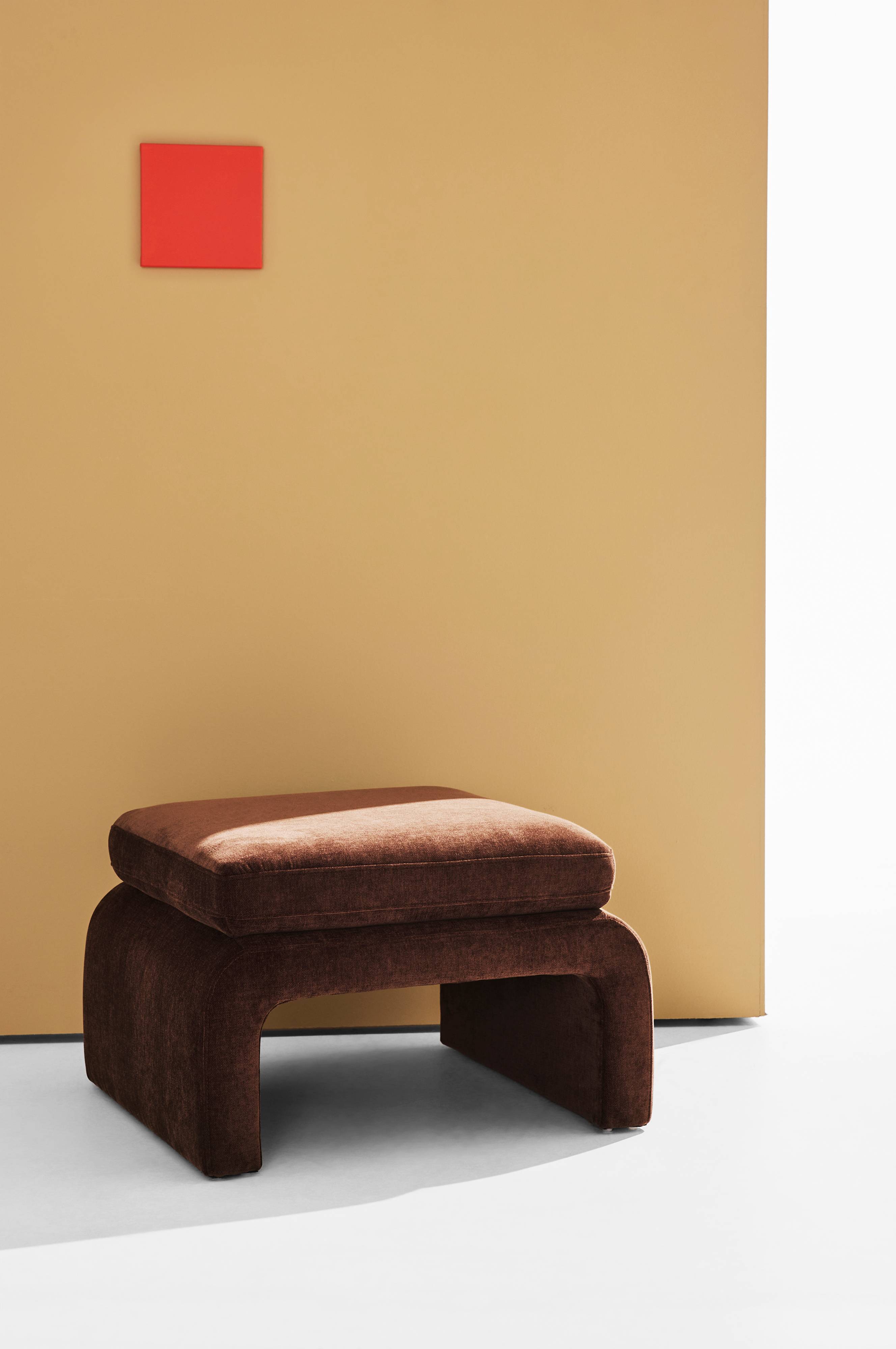 Sofistikeret, speciel i sit udseende og bølgende design. Møblerne i serien er rummelige og komfortable og lette at matche med hinanden. Puffen har en ramme af FSC-certificeret fyrretræ og krydsfiner kombineret med elastikbånd, koldskum og polyestervattering for høj komfort. Polstringen er ikke aftagelig. Pletter fjernes med en fugtig klud.