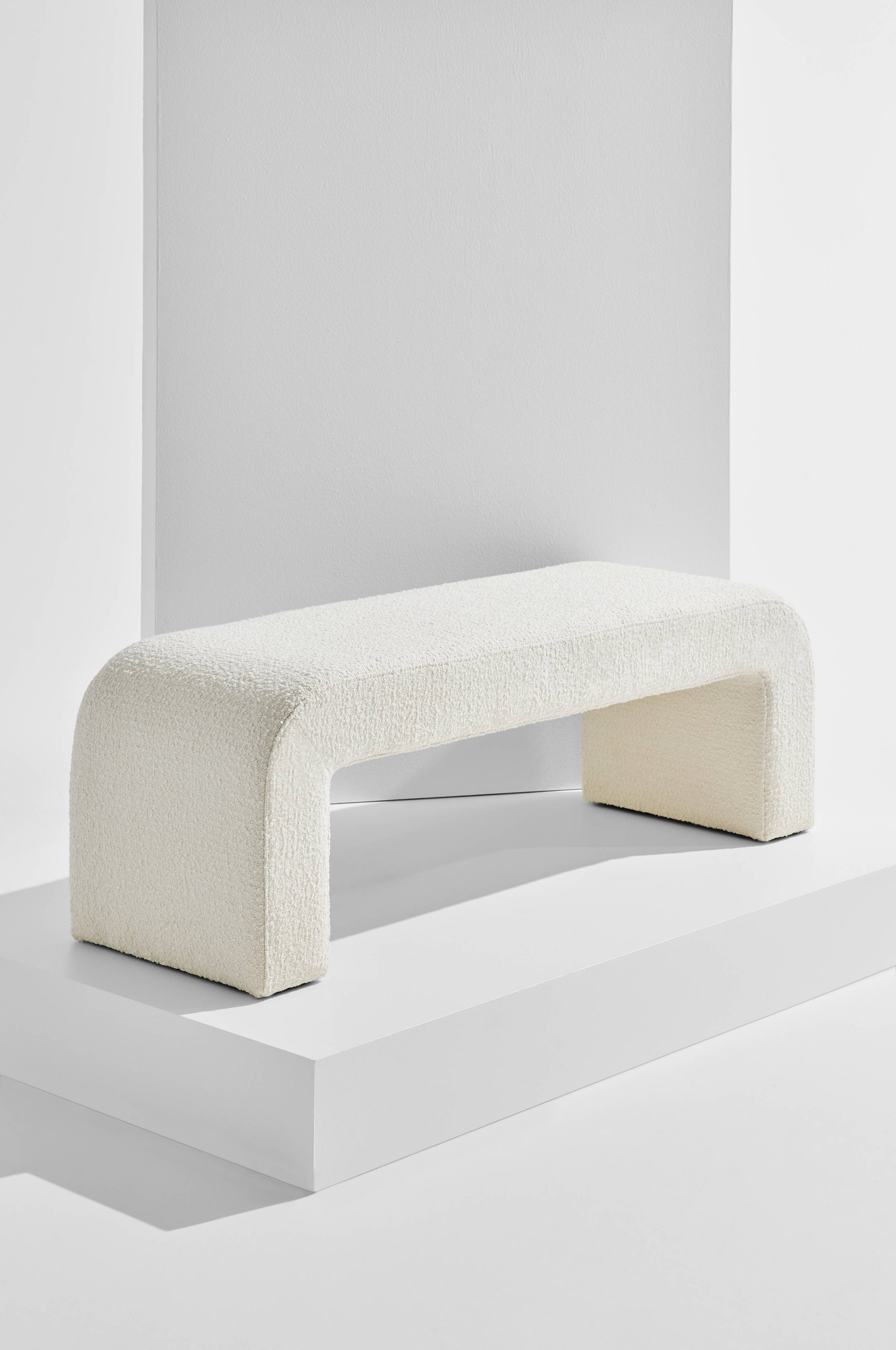 Bænk i lækker model med spændende form, beklædt med blød bouclé. Odette er et møbel med mange anvendelsesmuligheder, du får en skøn bænk i soveværelset og den bliver en flot detalje langs fodenden på sengen. Placér den bløde bænk i dagligstuen og den kan bruges både som fodskammel ved sofaen og som ekstra siddeplads. I en rummelig entre er det flot, indbydende og behageligt med en siddeplads. Den tiltalende u-form føles innovativ og ny. Garnet som stoffet er vævet af har små løkker og knuder som skaber et blødt stof med let krøllet overflade. Stoffet er meget slidstærkt med Martindale på 79000. Rammen er af FSC-certificeret fyrretræ og plywood som er beklædt med behagelig og fast polstring af koldskum. Betrækket er ikke aftageligt.