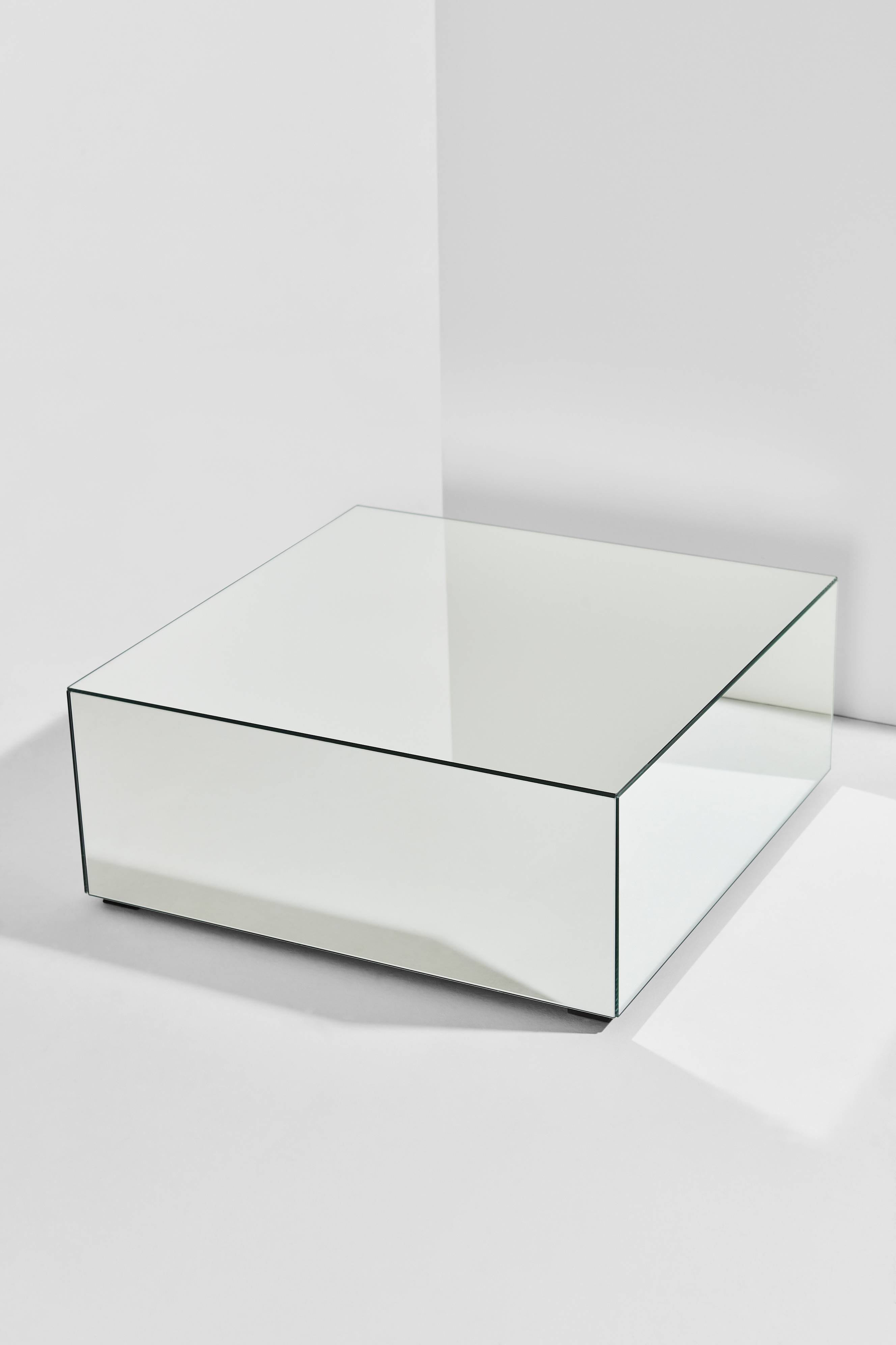 Et bord som tager plads og bliver rummets midtpunkt. Bordet har sider og bordplade i spejlglas. Små skjulte ben får bordet til at se ud som om det svæver lidt. Stellet er af FSC-certificeret MDF, som er dækket med spejlglas. Er lidt frækt, en blanding af lige dele nyt og retro.