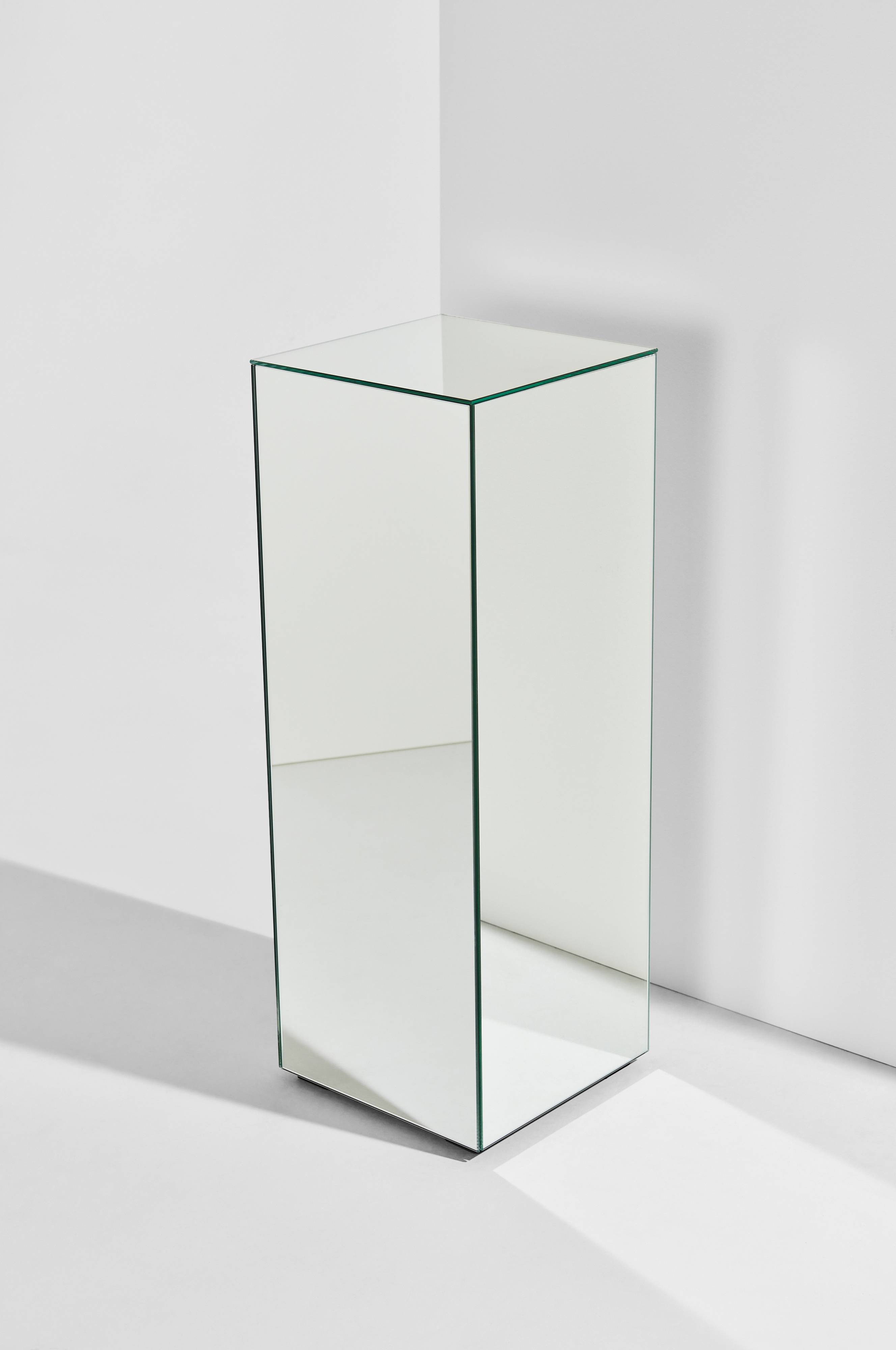 Et piedestal som tager plads og bliver rummets midtpunkt. Piedestalen har sider og top i spejlglas. Små skjulte ben får det til at se ud som om den svæver lidt. Stellet er af FSC-certificeret MDF, som er dækket med spejlglas. Er lidt frækt, en blanding af lige dele nyt og retro.