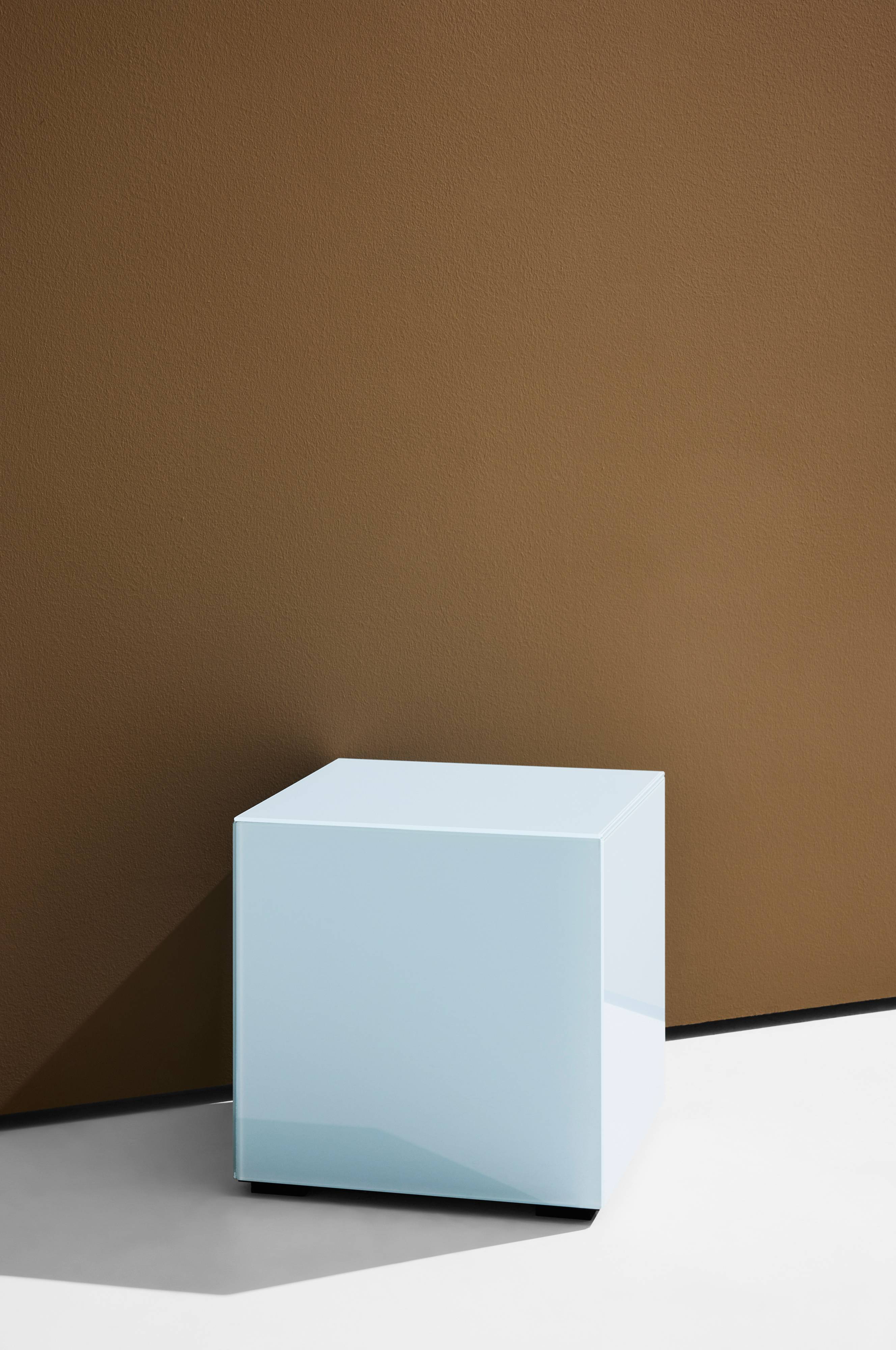 Kuben er en rigtig eye-catcher som stjæler al opmærksomheden. Den har sider og top af glas med farvestrålende, lakeret inderside som giver en lækker transparent effekt. Små skjulte ben betyder, at kuben ser ud som om den svæver lidt. Stellet er af FSC-certificeret MDF, som er dækket med spejlglas. Pop påvirker alle - ungt og frækt.