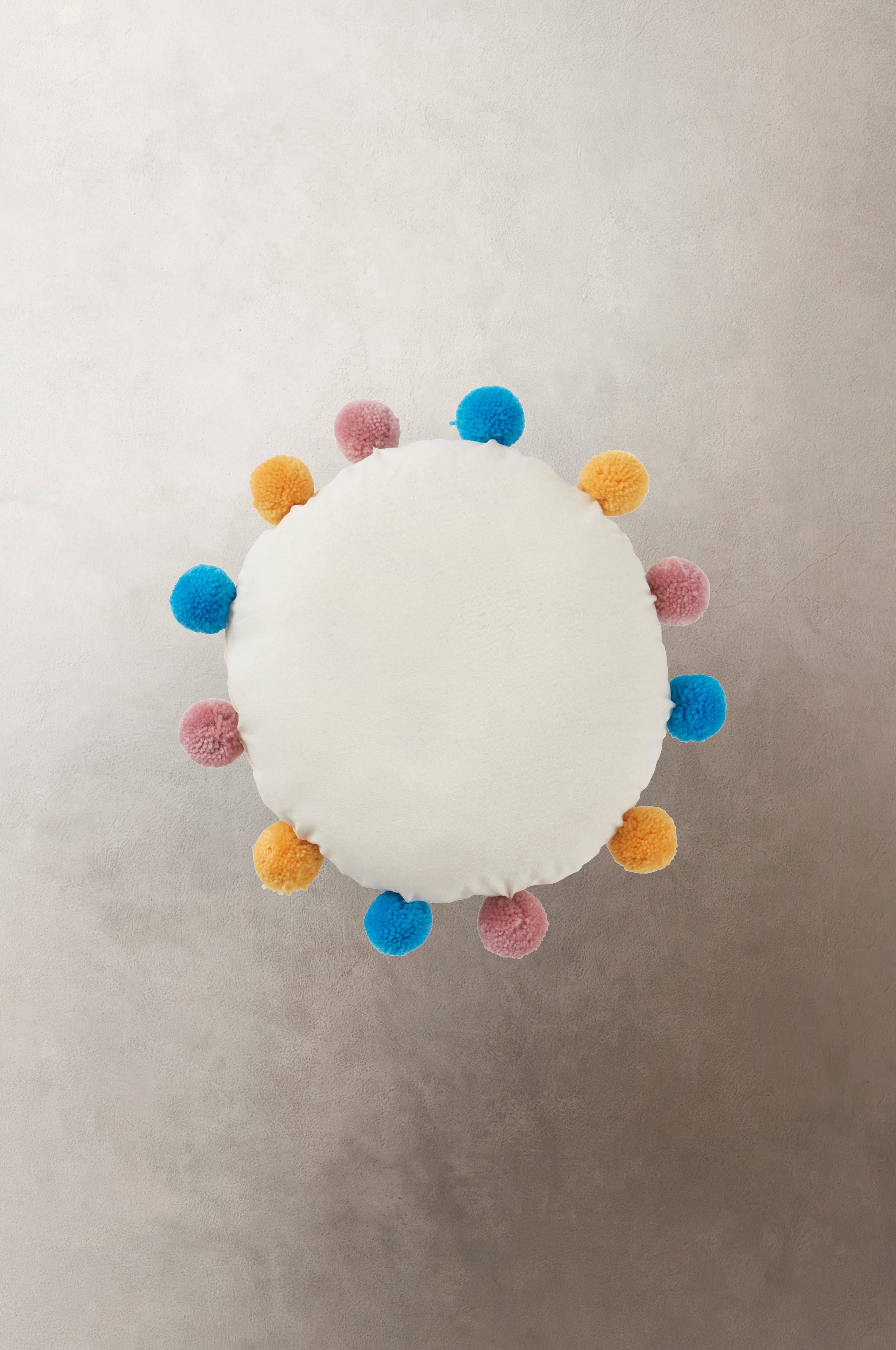 1-pak rund pude i kanvas af bomuld med dekorative garnbolde om kanten. Puden har blød polstring af polyester. Bagsiden er ensfarvet i samme stof som forsiden.