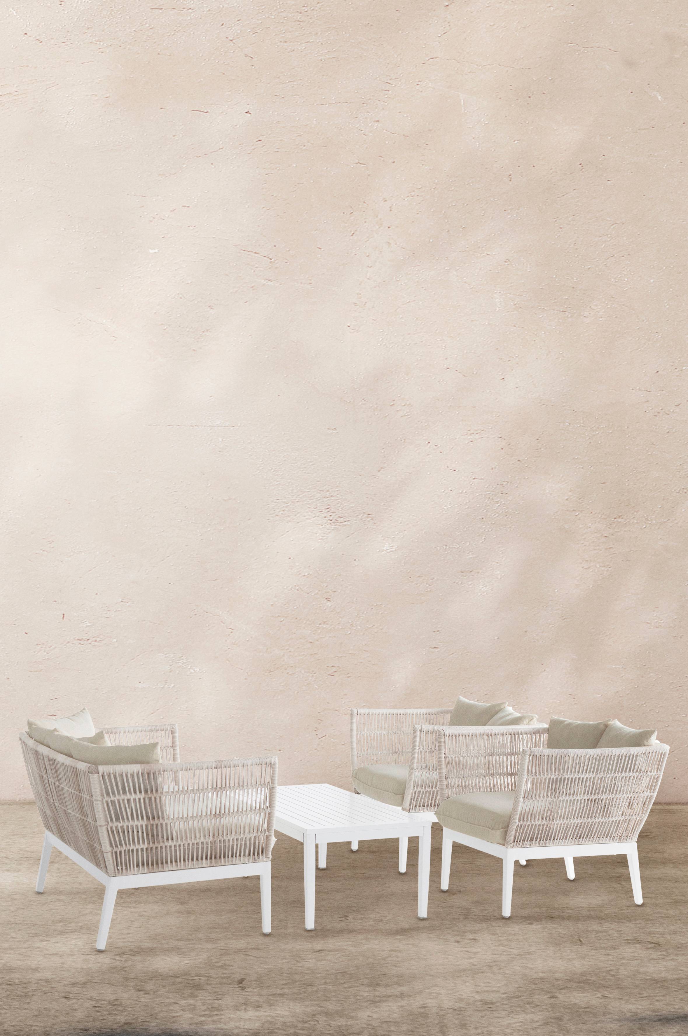 PORTOFINO er et komplet udendørsmøblement med en 2-pers. sofa, to stole med armlæn og et bord. Gruppen er i lækker loungestil af aluminium og kunstrotting, som er både holdbart og flot. PORTOFINO kan holde til at stå udendørs, og det gør udelivet lettere. Du slipper for at slæbe møbler rundt, når du vil sidde ude. Møblerne er komplette med tykke siddehynder og bløde pyntepuder.