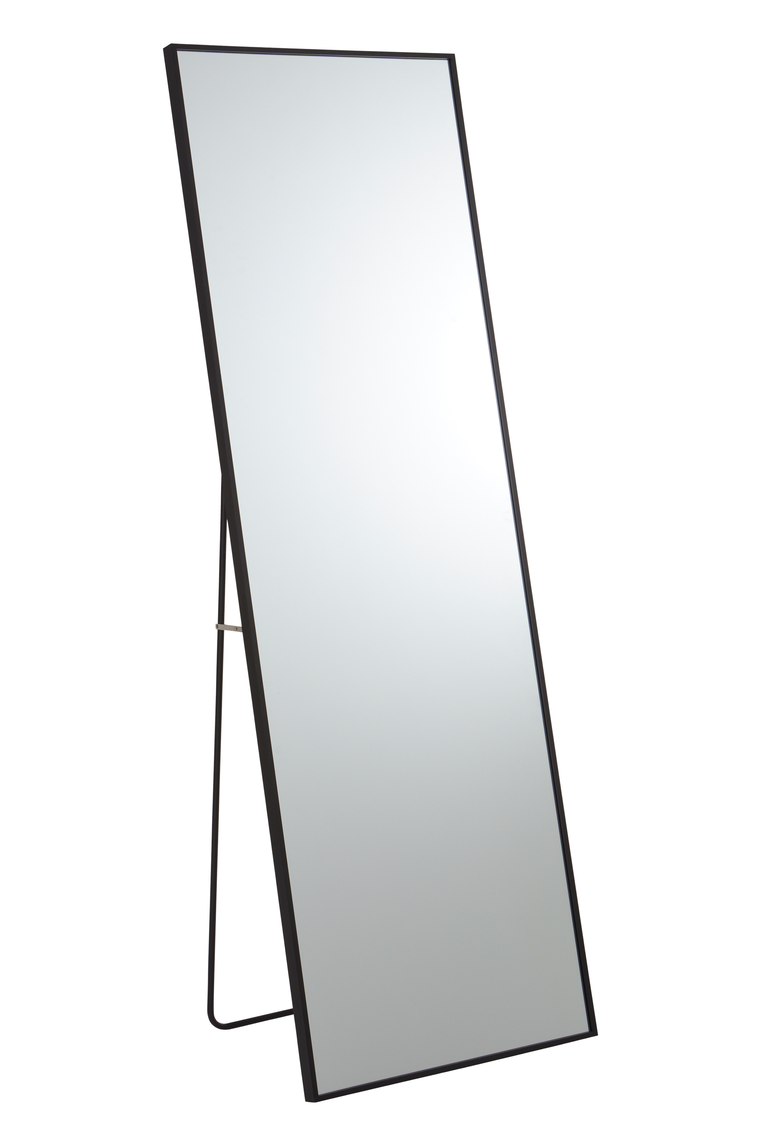 Højt og smalt rektangulært spejl med flot aluminiumsramme. Spejlet har et stativ som gør det fritstående - det står lidt skråt. Spejlet kan også stå skråt opad en væg. Bagsiden er af MDF.