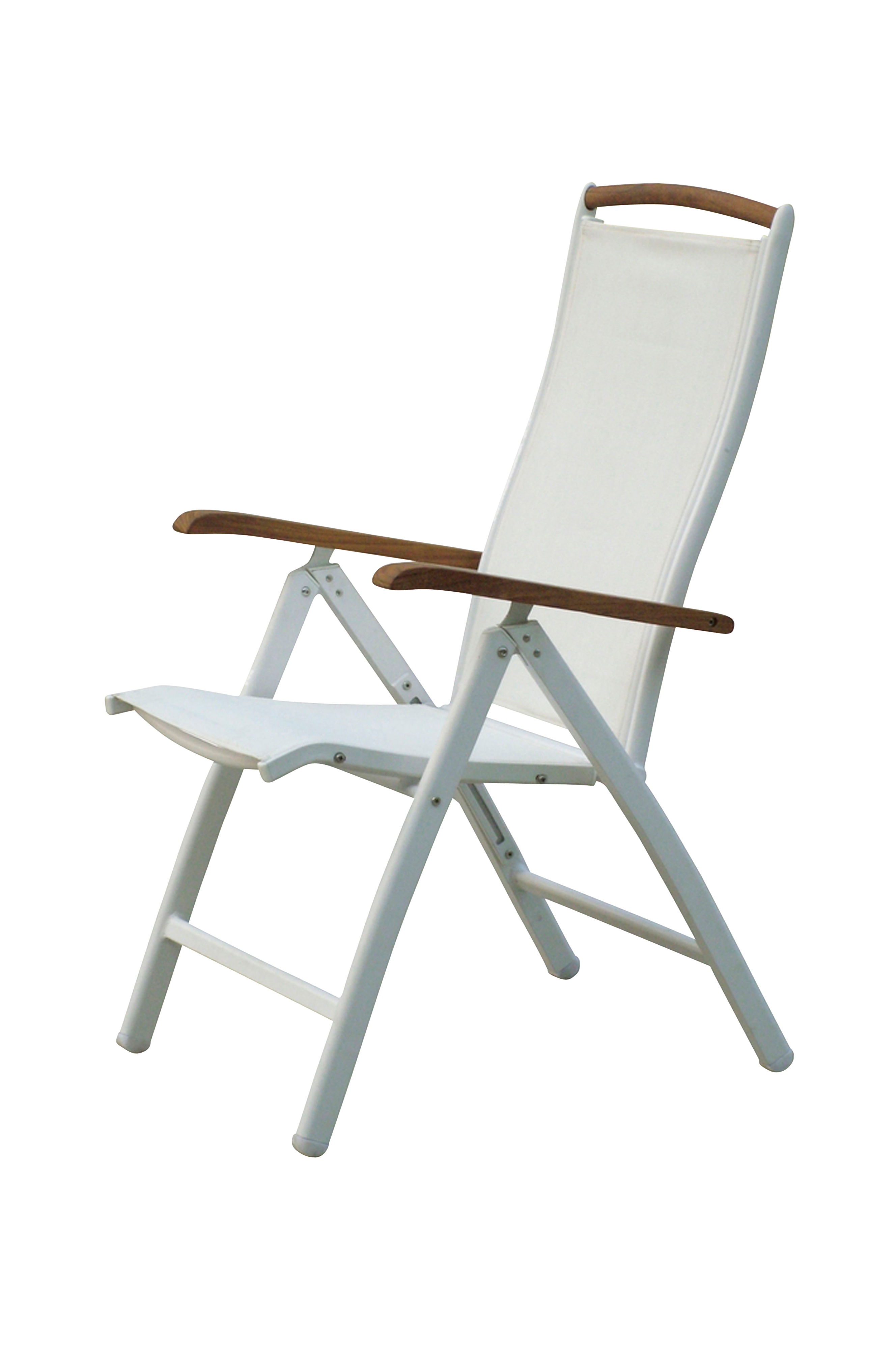 Positionsstol med stel i hvid aluminium. Sæde og ryg i hvid texilene og armlæn i teak. Detalje i teak foroven på ryglænet.