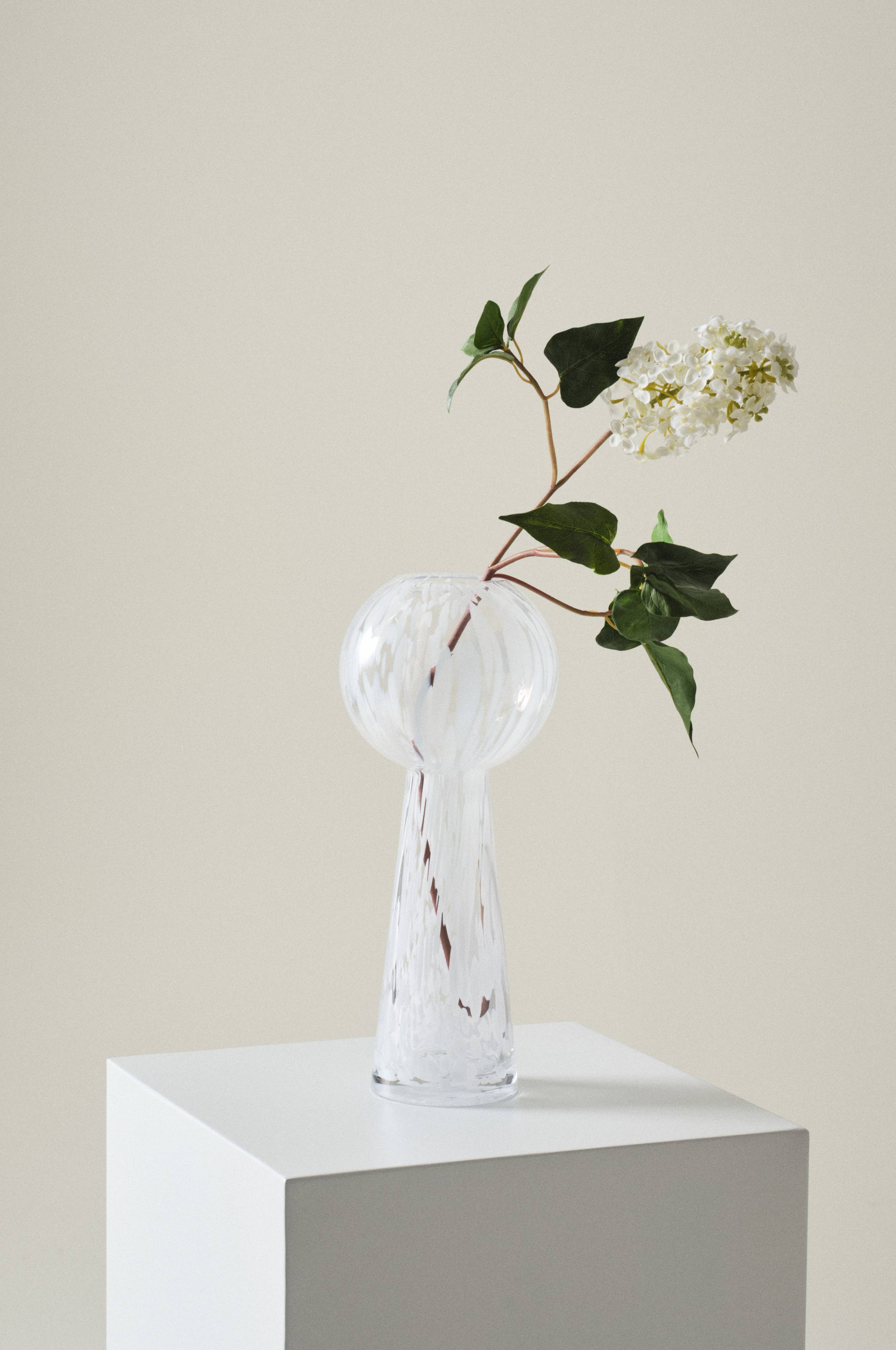 Håndlavet glasvase i klart glas med hvid dekoration i glasset. Den specielt formede vase fremhæver skønheden ved høje afskårne blomster. Håndværket gør hver vase unik.