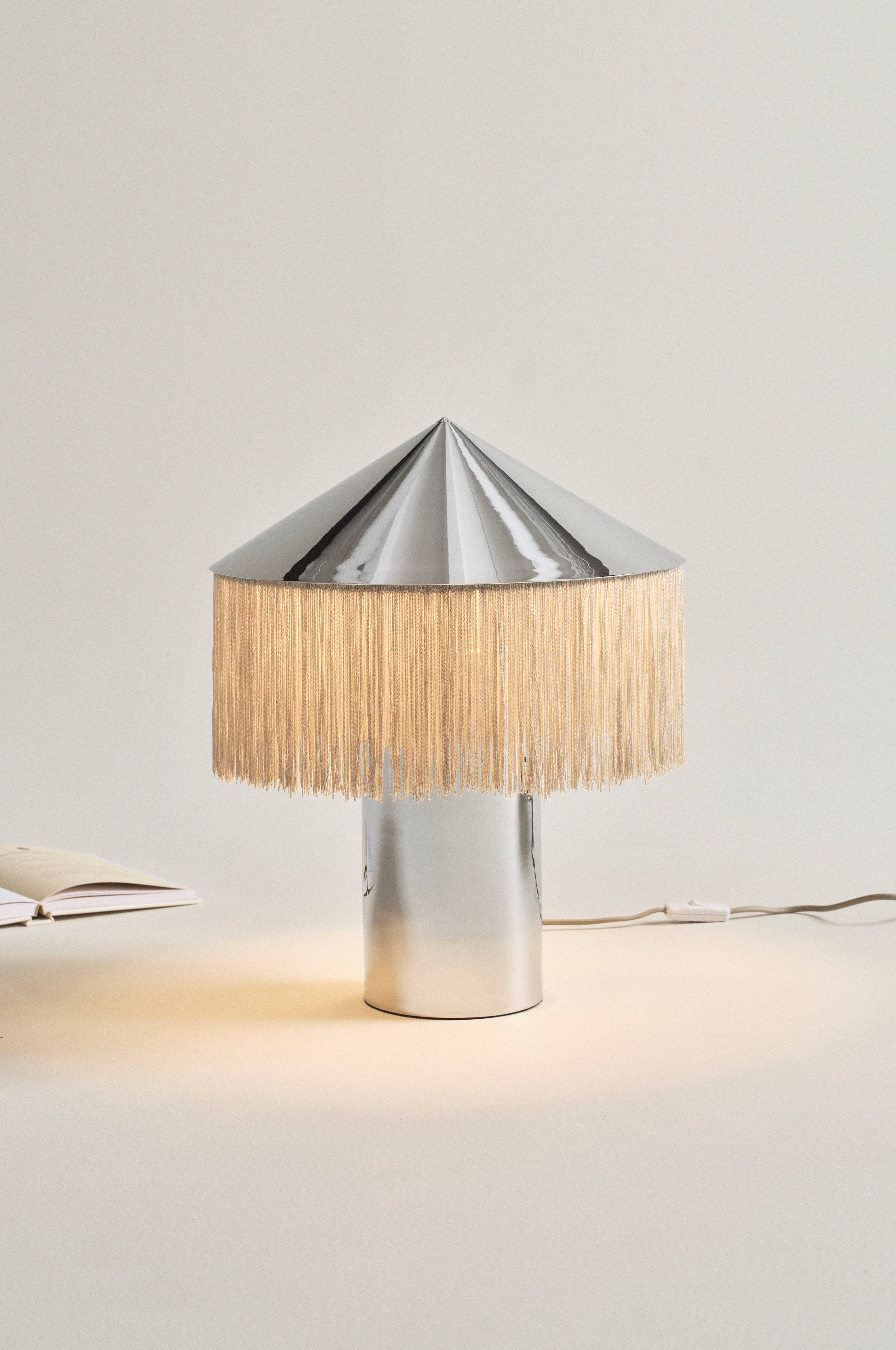 Bordlampe REGENCY er en utroligt lækker bordlampe som vækker opmærksomhed. Lampefod og skærm er af metal som er prydet med en lang frynsekant om skærmen. Lampen får en eksklusiv fornemmelse med en tekstilledning, der matcher frynserne, kontakten sidder på ledningen. Stikket er Europa-model, det vil sige fladt med tyndere stikben (4 mm). Lampen er ujordet, klasse 2.