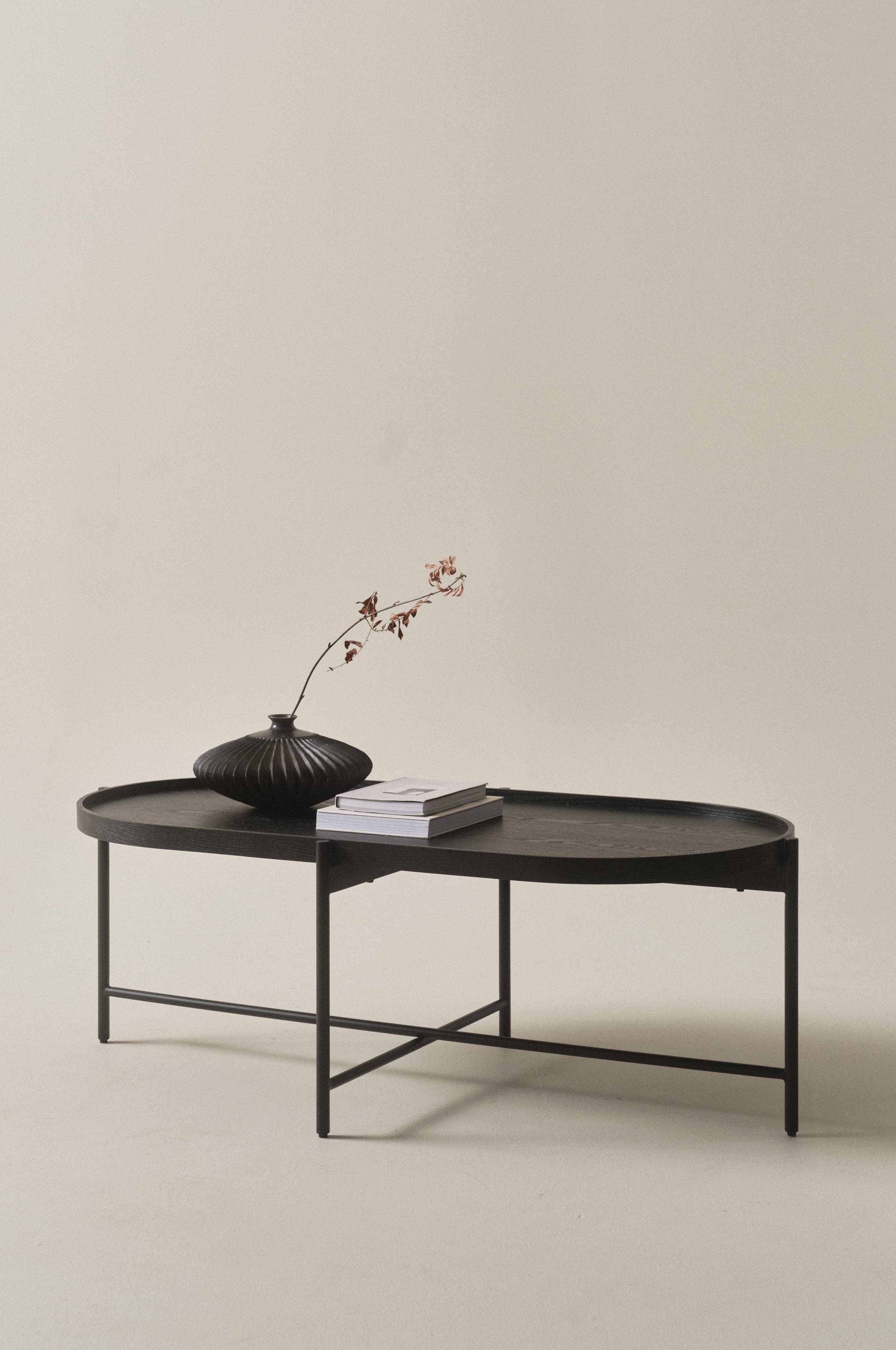 Ovalt sofabord med ben af stål og bordplade af FSC-certificeret MDF med askfinér. Bordpladen har en lille kant rundt om som flot detalje. Den har en sort, lakeret overfladefinish og årringen er dejlig diskret. Understellet er pulverlakeret og det omkranser bordpladen udvendigt, så følelsen af at bordpladen hviler i bunden forstærkes. RENO er et letplaceret sofabord, der blender behageligt ind. Den bløde, ovale form gør det nemt at komme rundt om bordet og slå sig ned i sofaen. Skal færdigsamles. Samlevejledning medfølger.