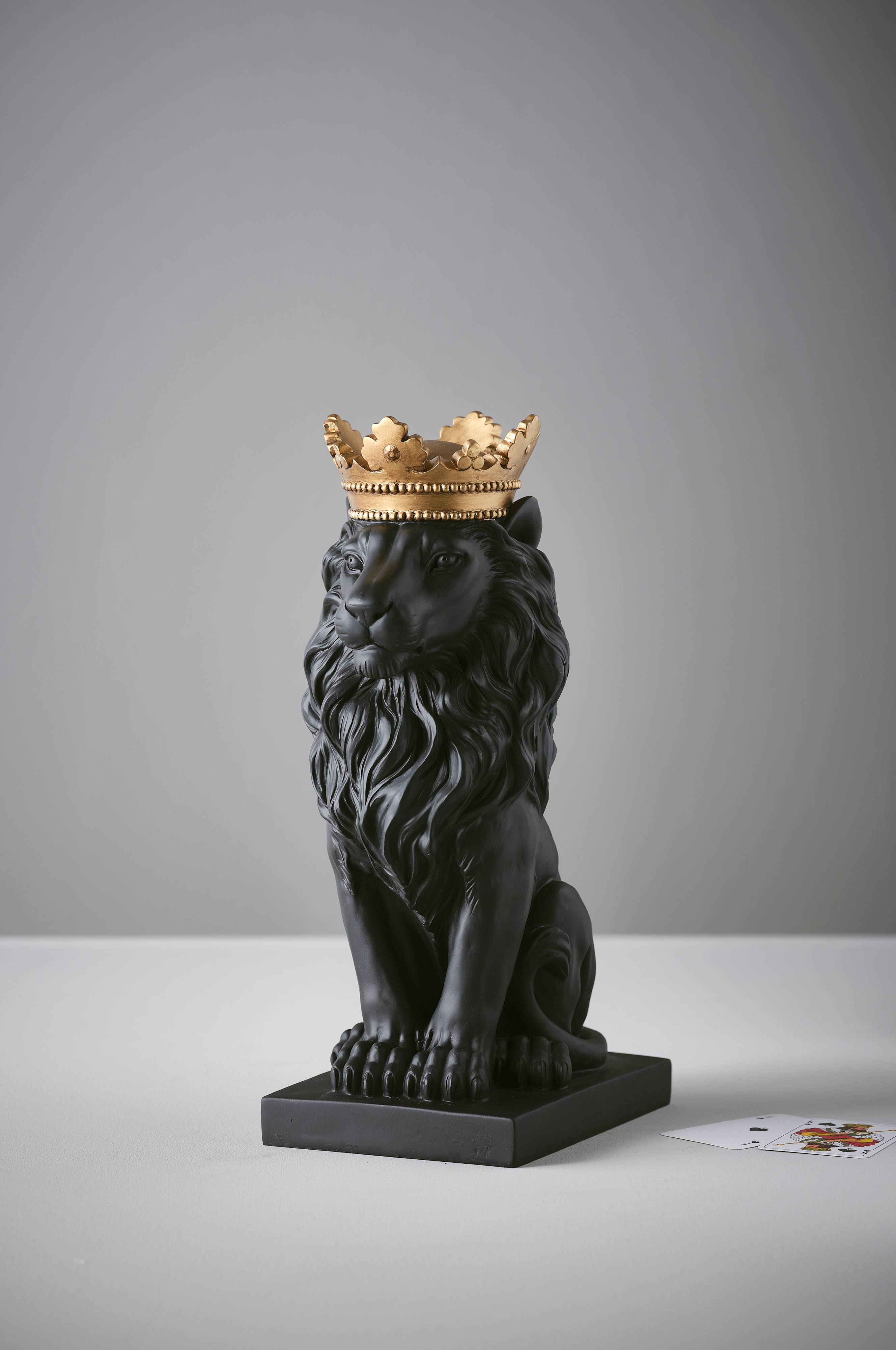 Flot løve i matsort polyresin med guldfarvet krone.