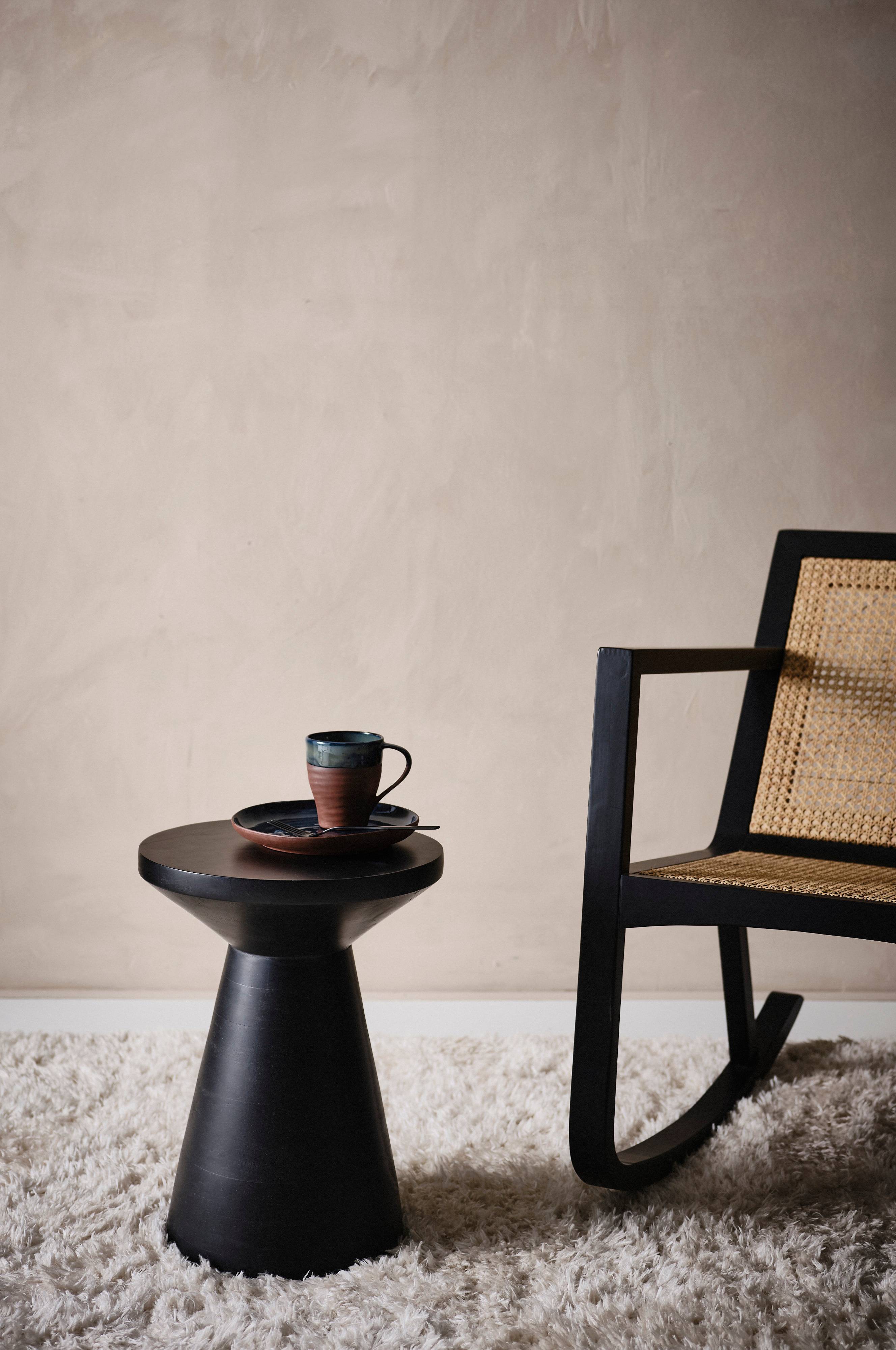Beskrivelse: Rund skammel/sidebord af malet mangotræ.