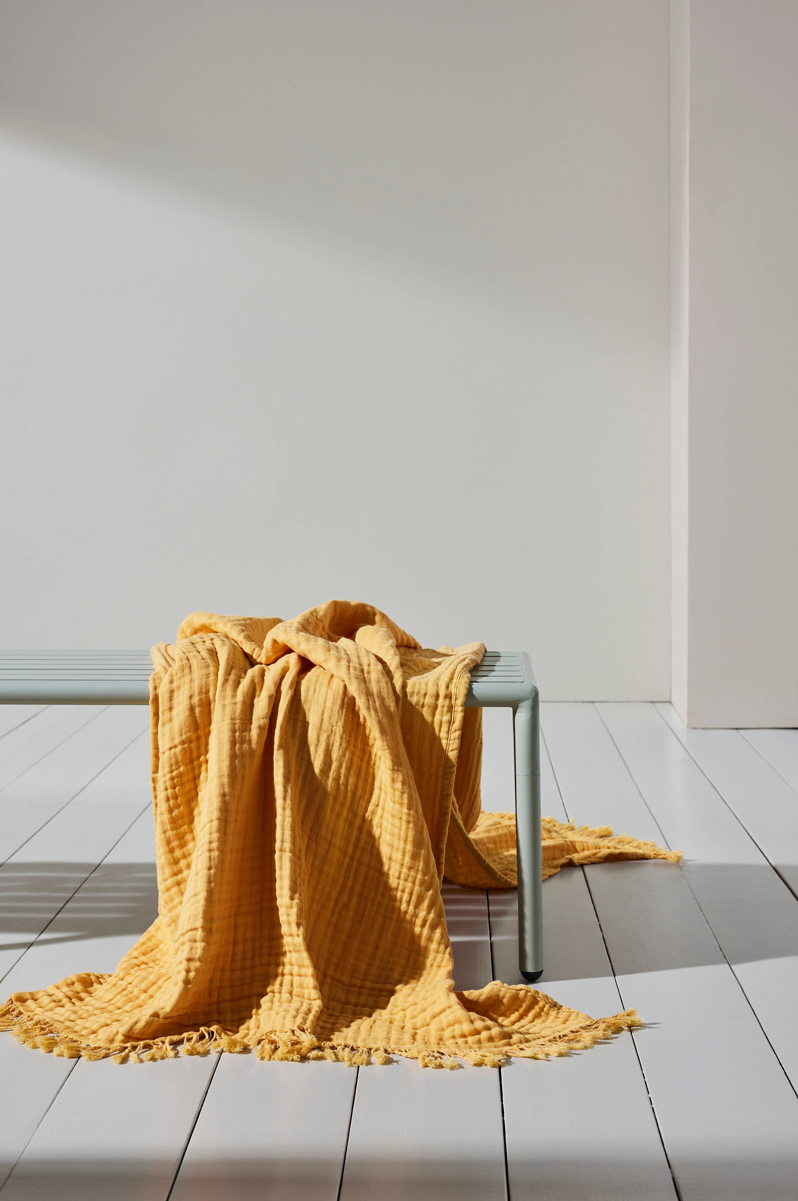 Ensfarvet plaid af bomuld med blød boblestruktur som betyder at plaiden føles luftig og sval. Bomuldsstoffet er enzymvasket for at opnå det skønne og lidt slidte look. Skønne pjuskede frynser i enderne.