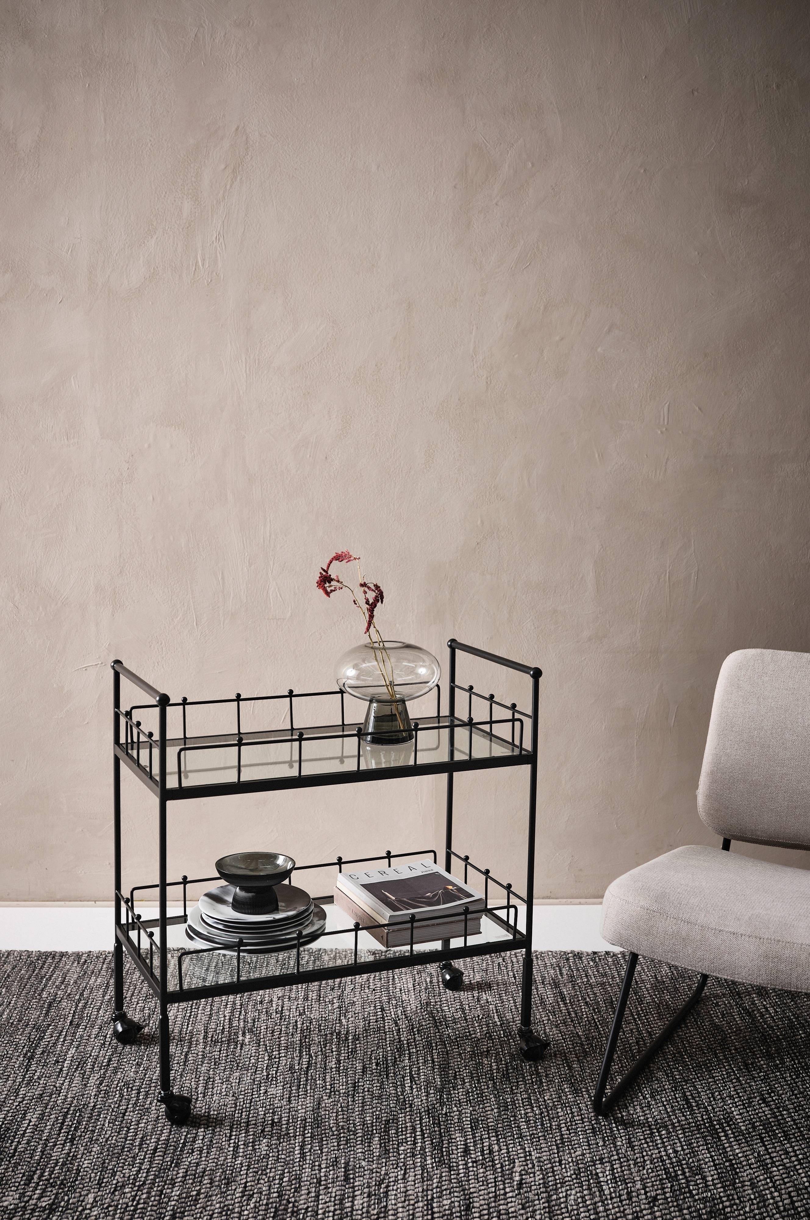 Serveringsvogn på hjul i pletteret metal med hylde af glas. Serveringsvognen fortjener en renæssance i hjemmet, et spændende møbel med stor fleksibilitet. Du ruller let vognen med omkring, og du kan bruge den som kaffebord, aflastningsbord, sidebord eller barvogn. Den elegante stil med glashylder bliver et glamourøst indslag i din indretning. Skal færdigsamles.