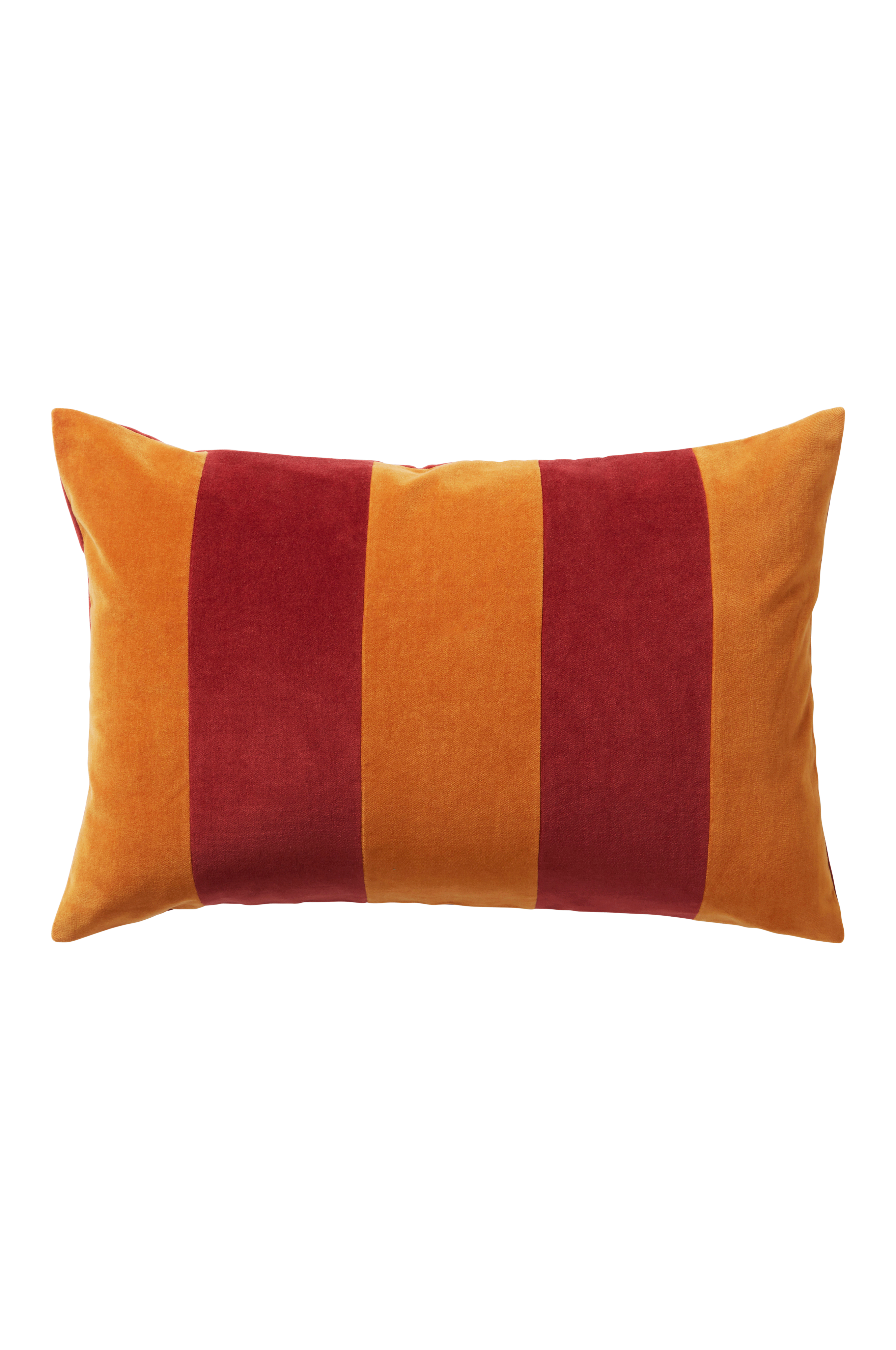 1-pak pudebetræk i blød velour af bomuld med mat overflade. Forsiden på pudebetrækket er syet i patchworkteknik og de brede striber er i velvalgte nuancer. Velourstoffet har en flot glans og striberne skinner i smukke nuancer med lyset, stoffet er vasket for en ekstra blød fornemmelse. Bagsiden er ensfarvet i en af stribernes farve. Skjult lynlås på bagsiden. Pudebetrækket er foret med microfiber af polyester. Stoffets gramvægt er 230 g/m².