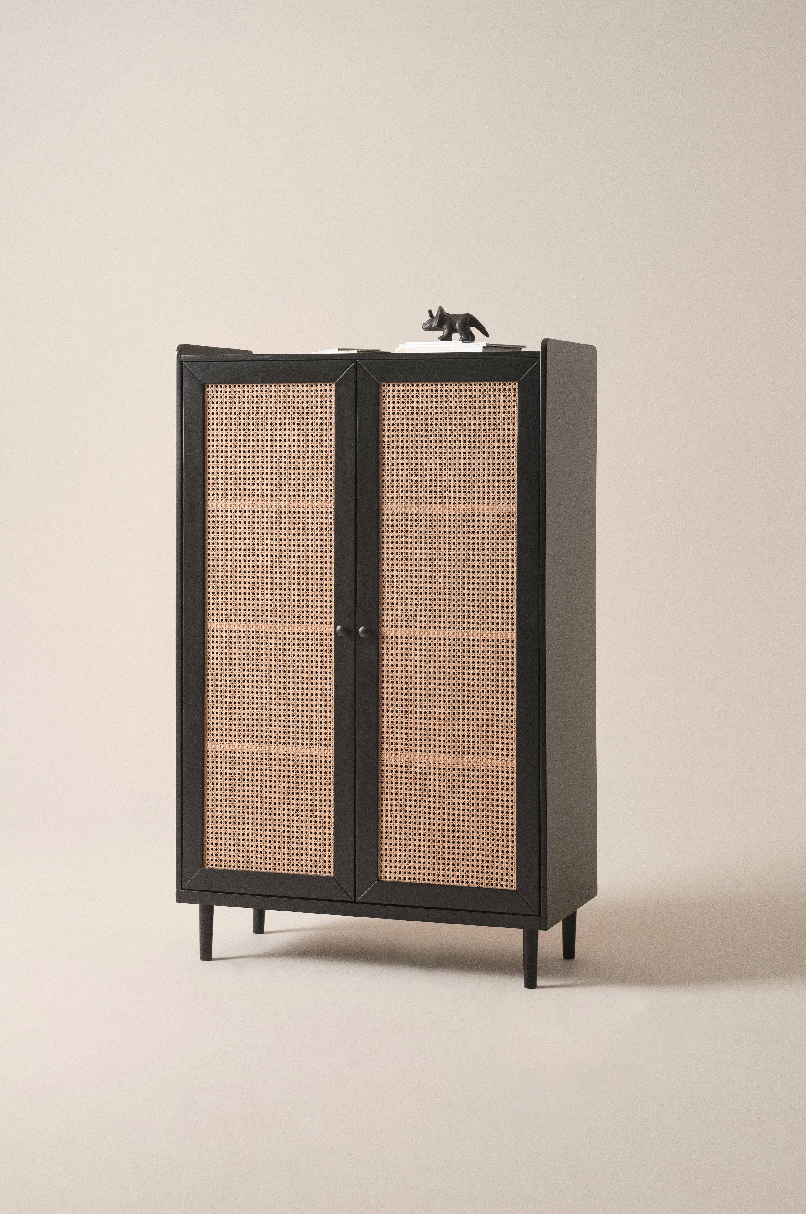 Garderobeskab i FSC-certificeret fyrretræ og MDF. De to låger har fin rotting og soft close-hængsler. Lågerne har en diskret knop, som har samme farve som skabet. Indvendigt er garderobeskabet todelt, har bøjlestang af metal, hvor du kan hænge barnets tøj på bøjler, samt faste hylder. Garderobeskabet er malet med vandbaseret maling, rottingen er naturfarvet. SALVADOR skabet er utroligt praktisk på børneværelset til barnets tøj. Vægbeslag medfølger. Nogen montering kræves. Samlevejledning medfølger. Bøjler medfølger ikke.