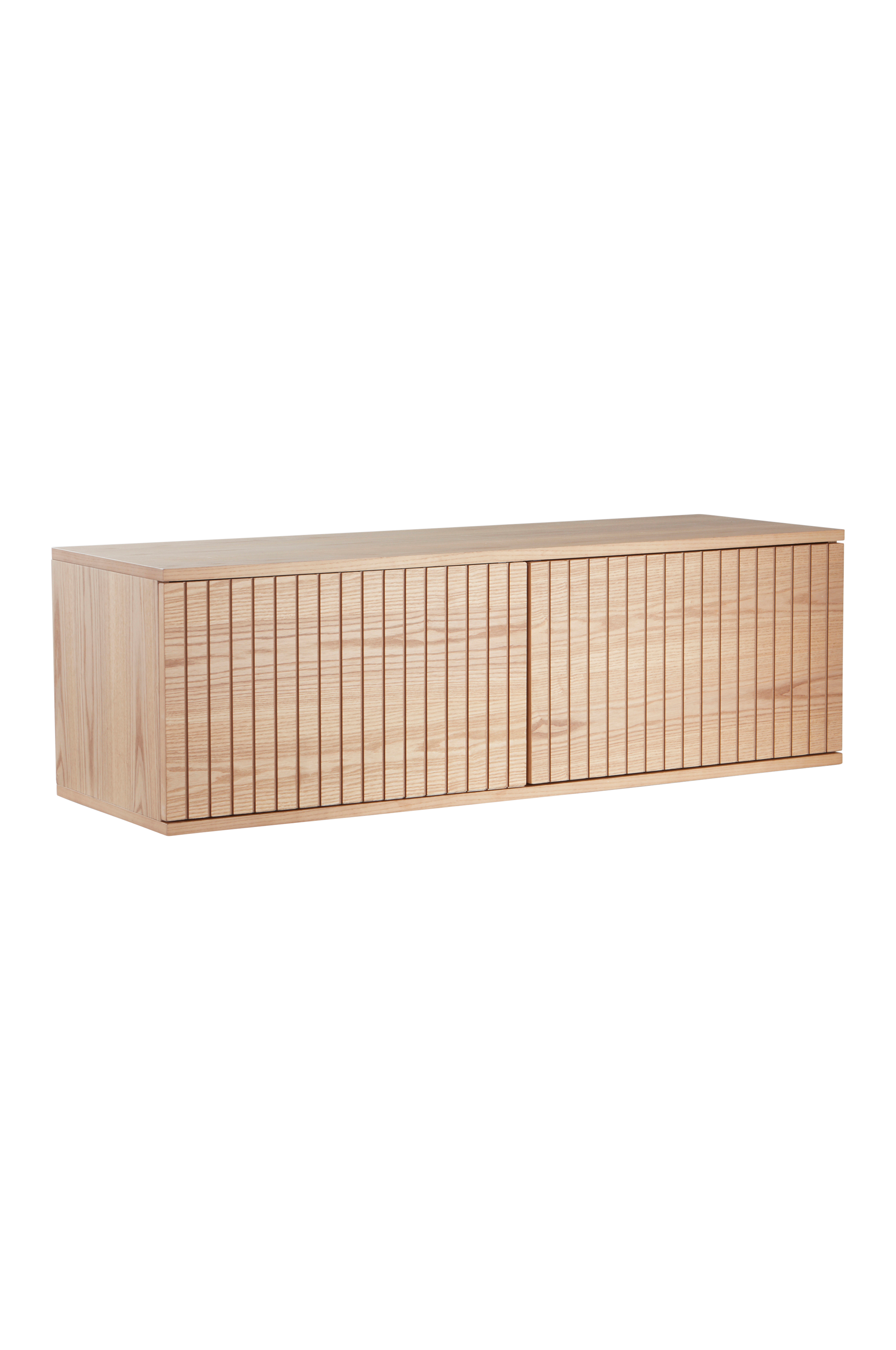 Skænk af MDF med askefinér i to versioner: vælg mellem klar lak, hvor årringene træder frem, eller sortlakeret. De to låger har fræste, vertikale rande som giver en stribet effekt. Push-funktion gør det nemt at åbne og lukke lågerne, og skabet får en ren front uden greb. Skabet er væghængt hvilket er både flot og praktisk. Du bestemmer, hvor højt det skal hænge og det er nemt at gøre rent nedenunder. Praktisk som TV-bænk, så du får perfekt højde på dit TV. En indvendig hylde i hver del. Huller toil ledninger i bagstykket hvis du vil bruge skabet til dine medieenheder. Praktisk ophængningsramme i fyrretræ. Nogen montering kræves. Samlevejledning medfølger.