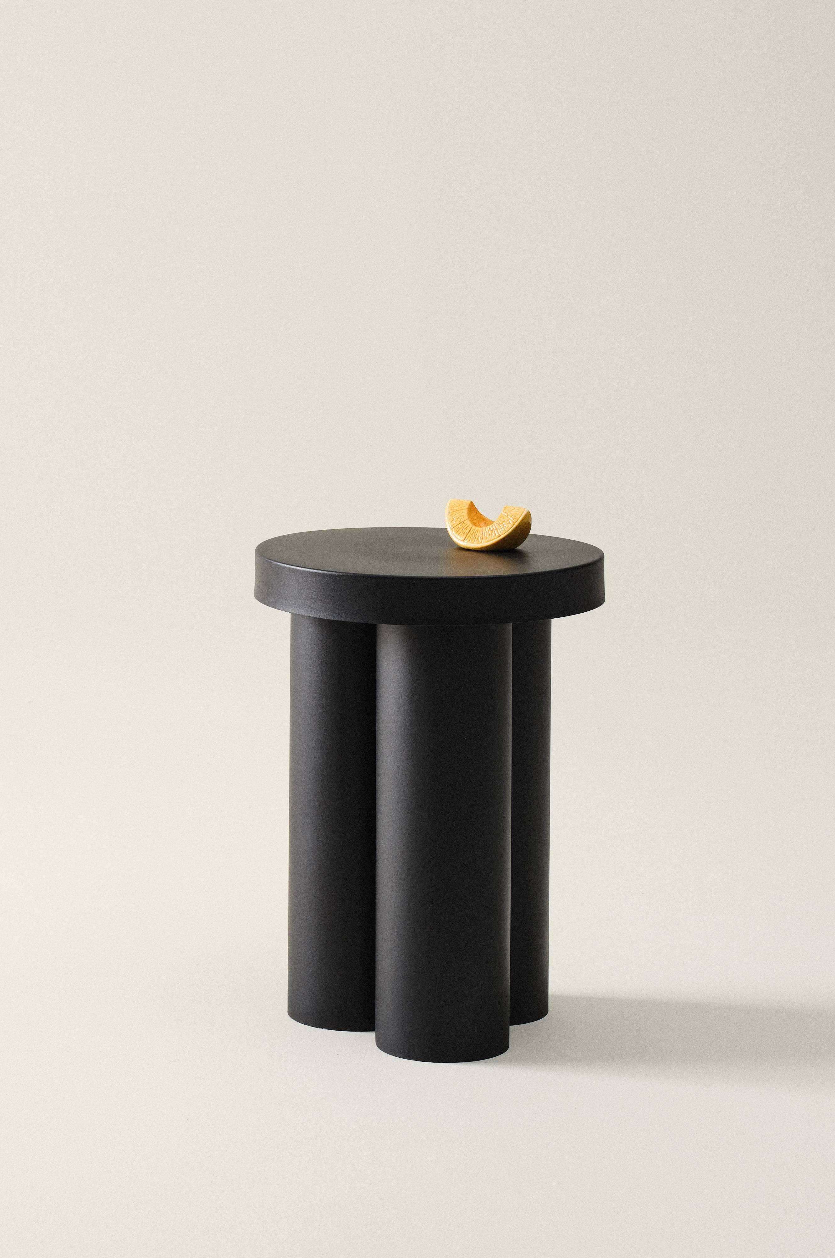 Sidebord i jern med søjlebund bestående af tre runde rør sat sammen og en rund bordplade ovenpå, som giver flotte proportioner. Bordet er helt ensfarvet og overfladen er pulverlakeret med mat finish. Sidebordet skaber et let og legende udtryk i rummet.