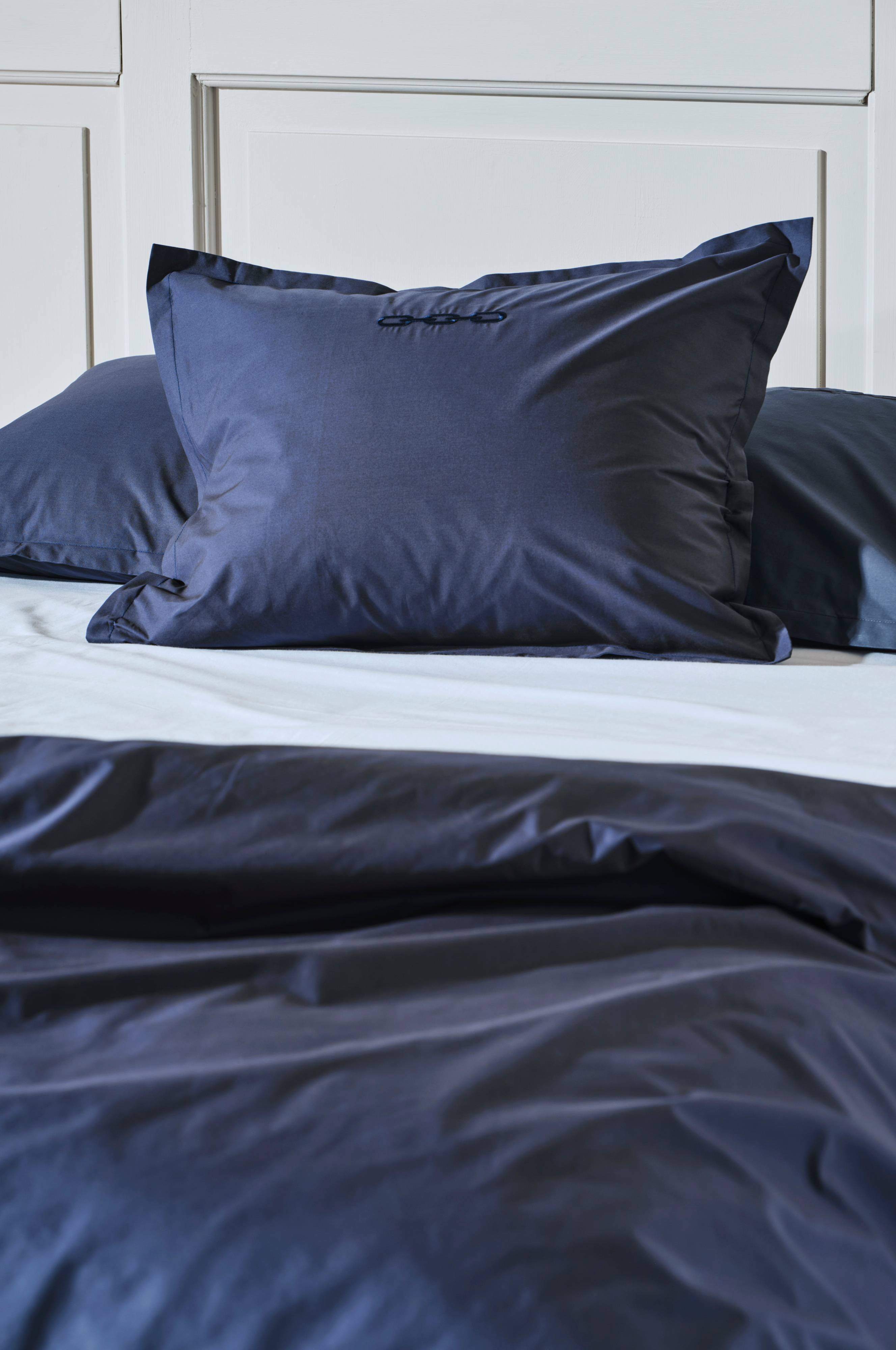 Pudebetræk i ensfarvet bomuldspercale med broderet mønster. Trådtæthed på 200 tc. (Trådtætheden angiver antal tråde, Thread Count, pr. kvadrattomme i et stof. Jo højere trådtæthed, jo højere kvalitet).