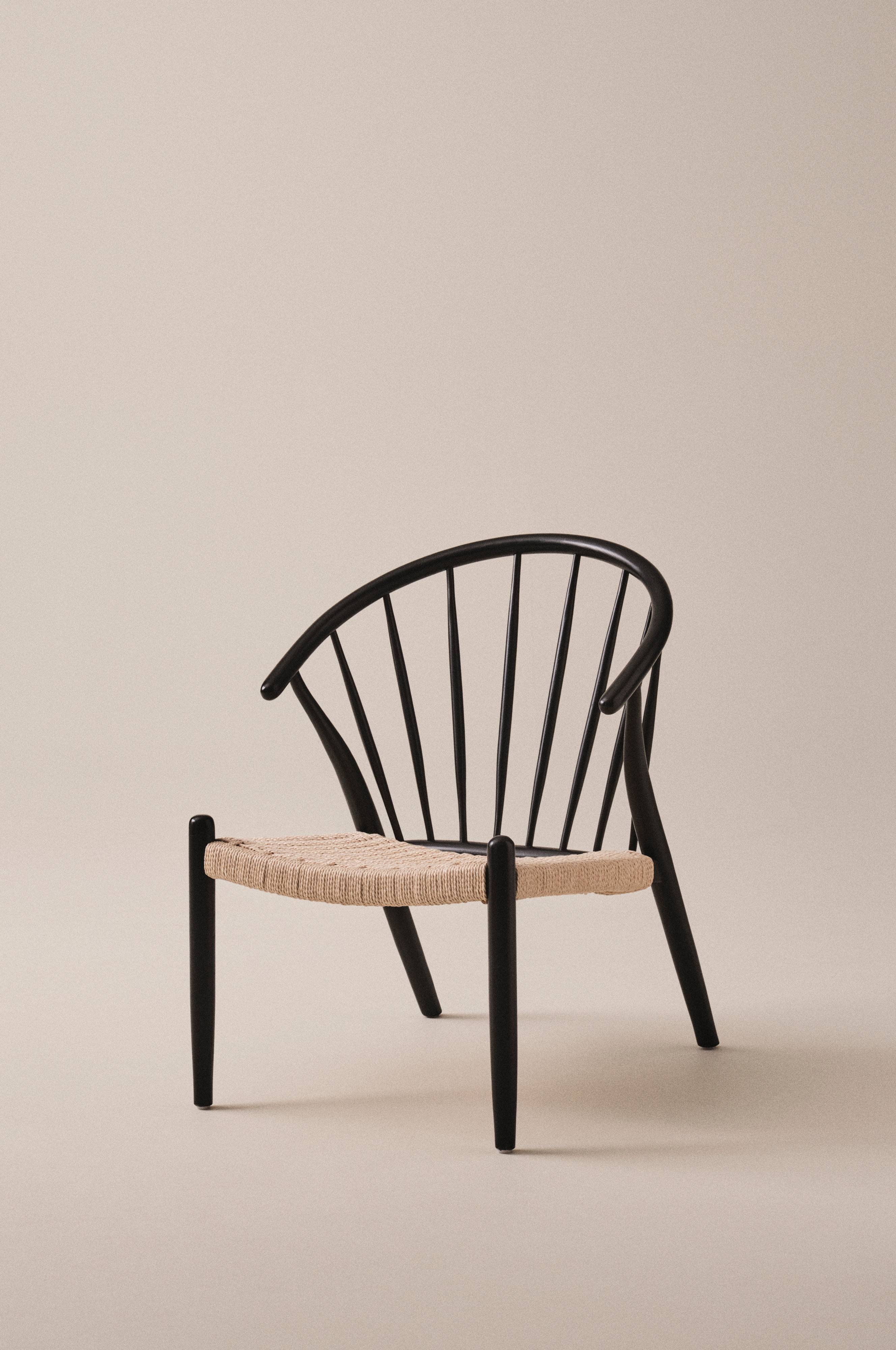 Loungestol af elmetræ med sæde af flettet snor. Skandinavisk stil i, klassisk og stilrent design. SAREK er en stilren loungestol som er lige så flot alene, som den er sammen med flere stole rundt om et matchende bord.