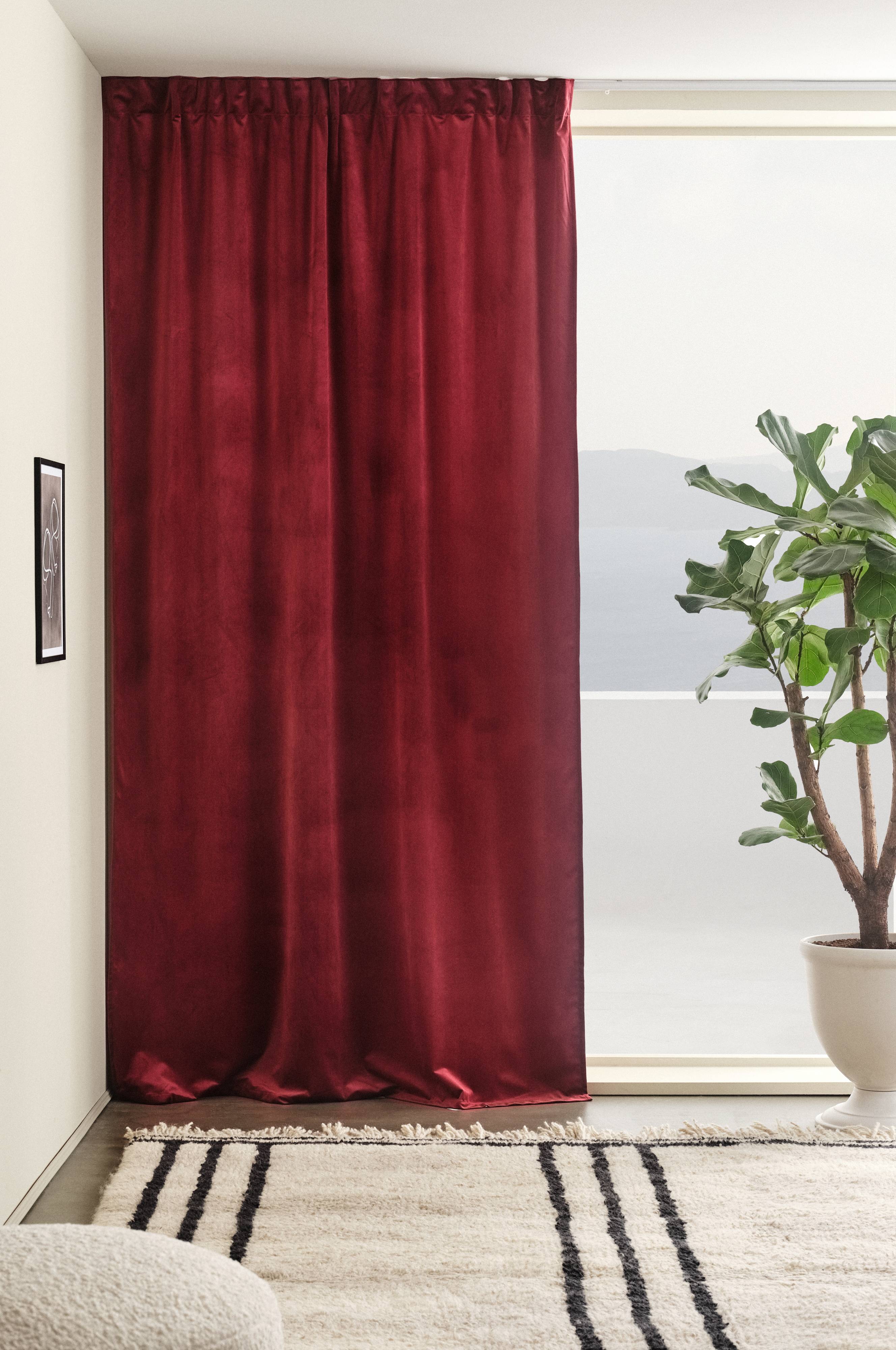 En gardinlængde i ensfarvet polyesterfløjl. Fløjl har en flot glans og en blød fornemmelse, og farven skinner smukt i forskellige lys.
