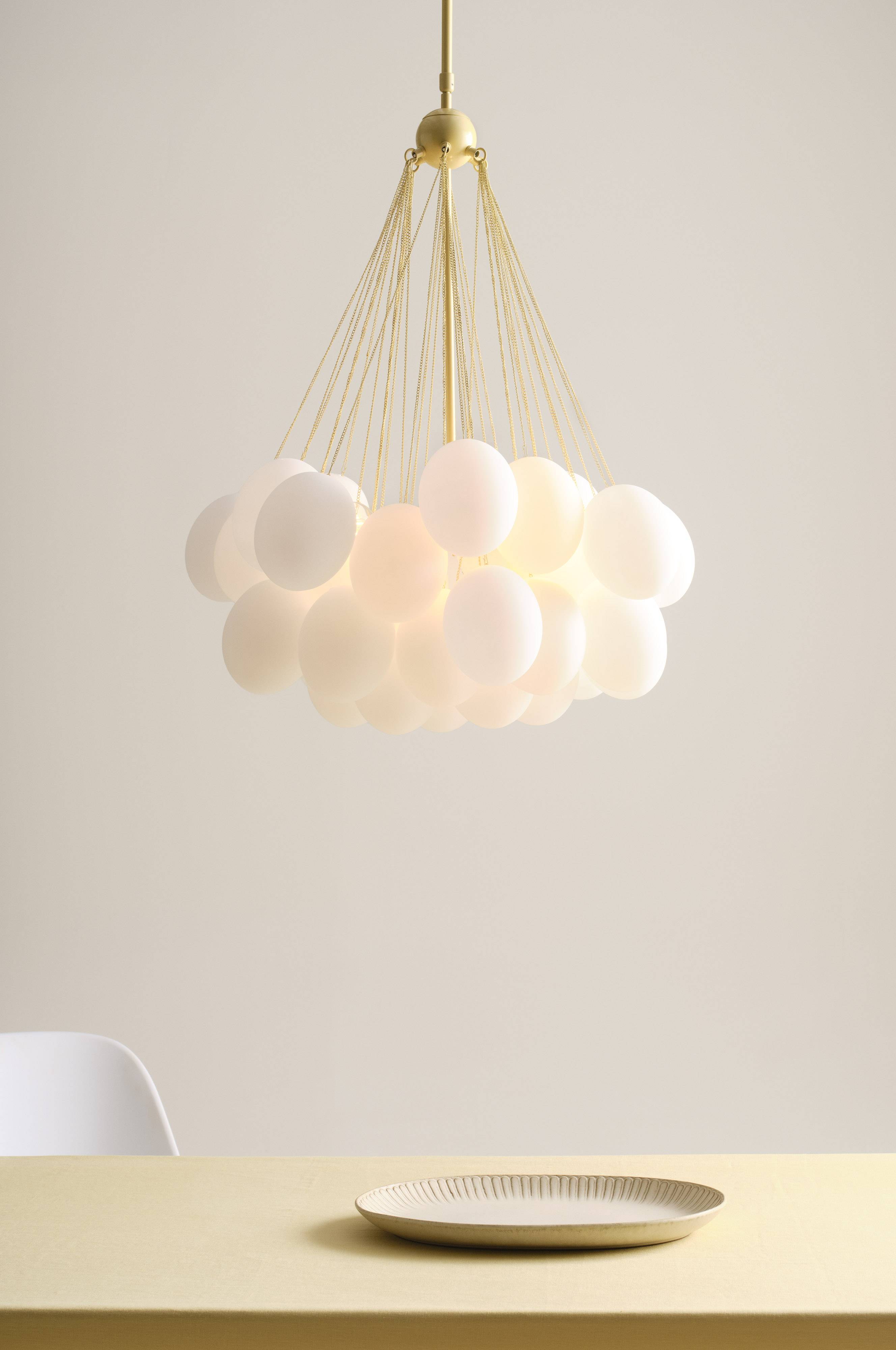 Loftslampe med 37 runde kugler af opalglas, i seks af kuplerne er der en lysestage, som får lampen til at sprede et behageligt skær. Kuplerne hænger i en flot klynge og danner en storslået og spændende loftslampe over f.eks. spisebordet. Stellet og loftskoppen er lavet af jern.