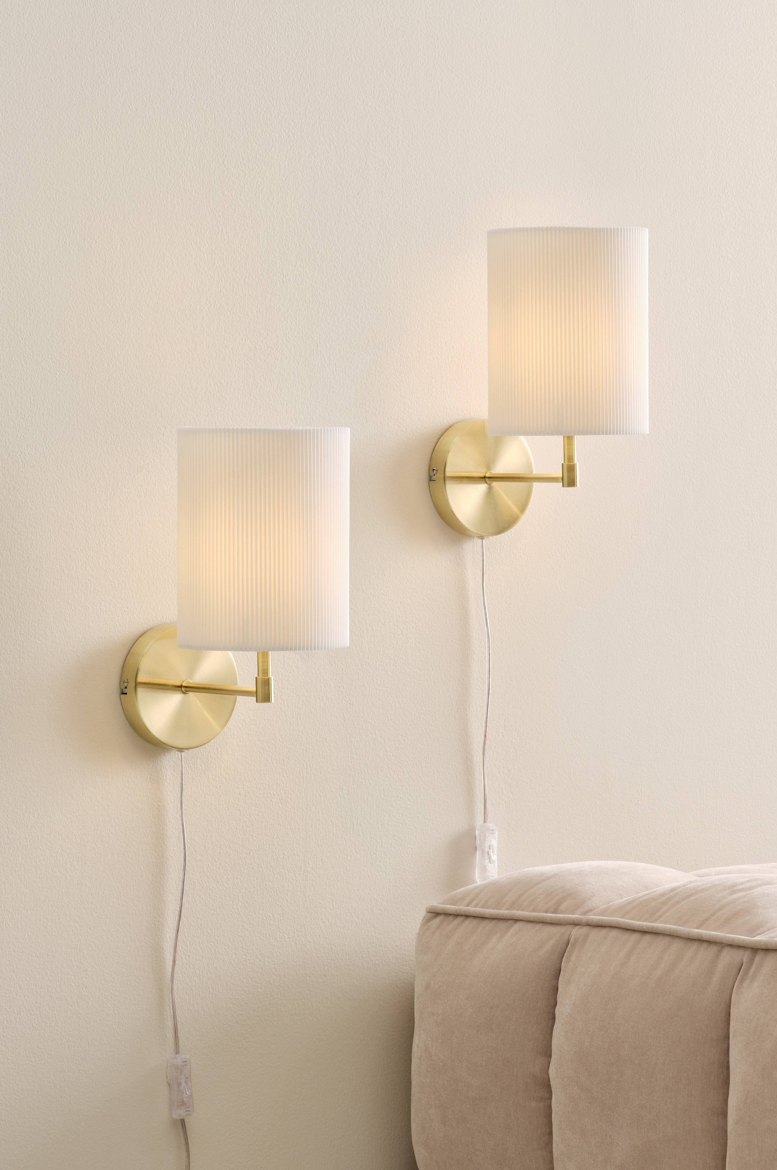 Pakke med to væglamper. Hver lampe har en fin, plisseret bomuldsskærm, som spreder et blødt lys. Lampefoden er lavet af jern. Gennemsigtig PVC-ledning med afbryder på ledningen. Disse to lamper er perfekte til at tilføre elegance til din stue, men de passer også godt ind i din entré, dit soveværelse eller andre steder, hvor du har brug for et smukt lys.