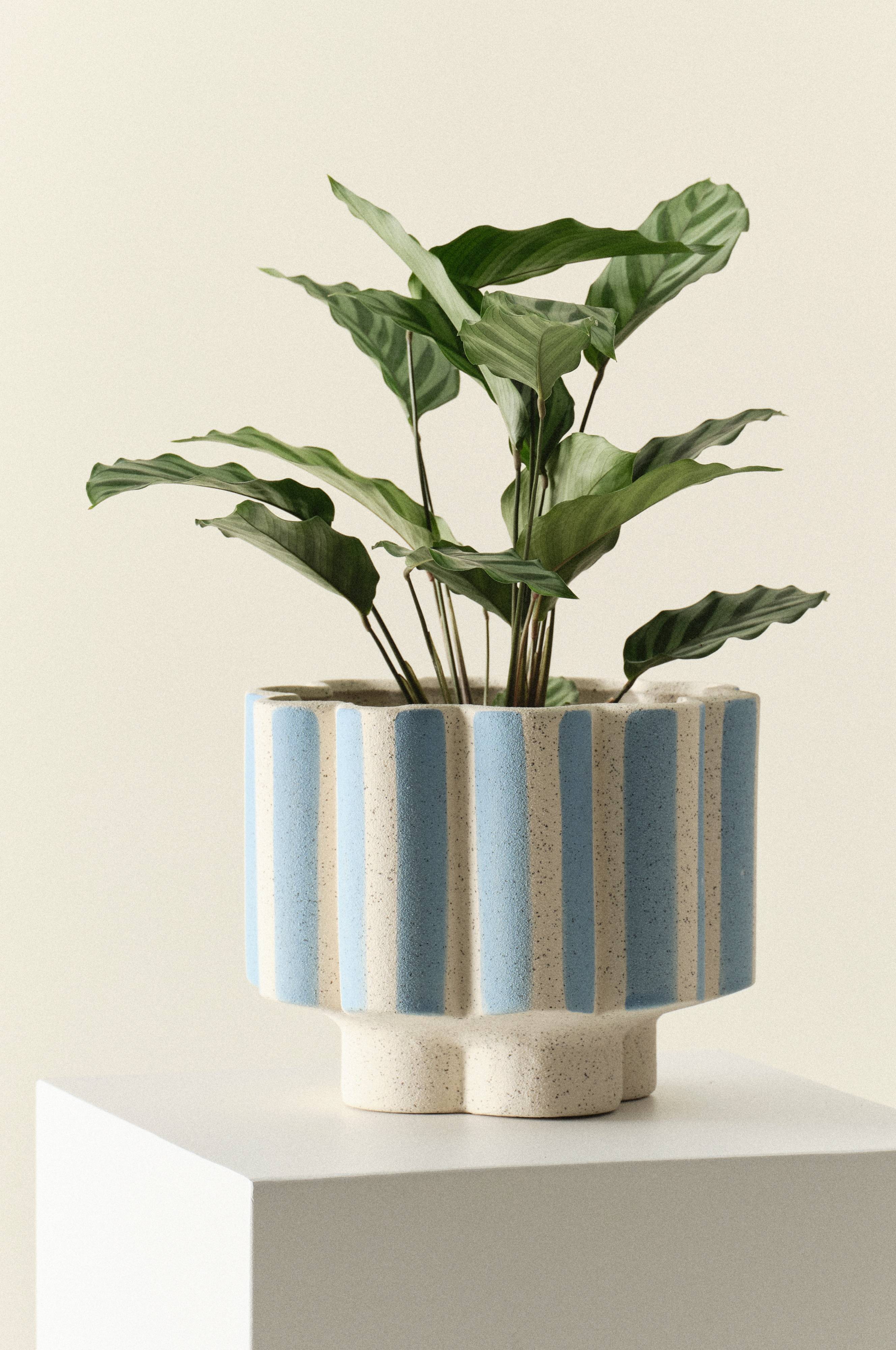 Stribet krukke af keramik. Formen er som en blomst, og den har en fod i midten, der får den til at rejse sig et par centimeter fra underlaget. Krukke har offwhite stenfinish med lyse striber. Krukken er glaseret i hånden. Også indersiden er glaseret. Det fine håndværk gør hver potteskjuler unik. Der kan trænge fugt igennem keramik.