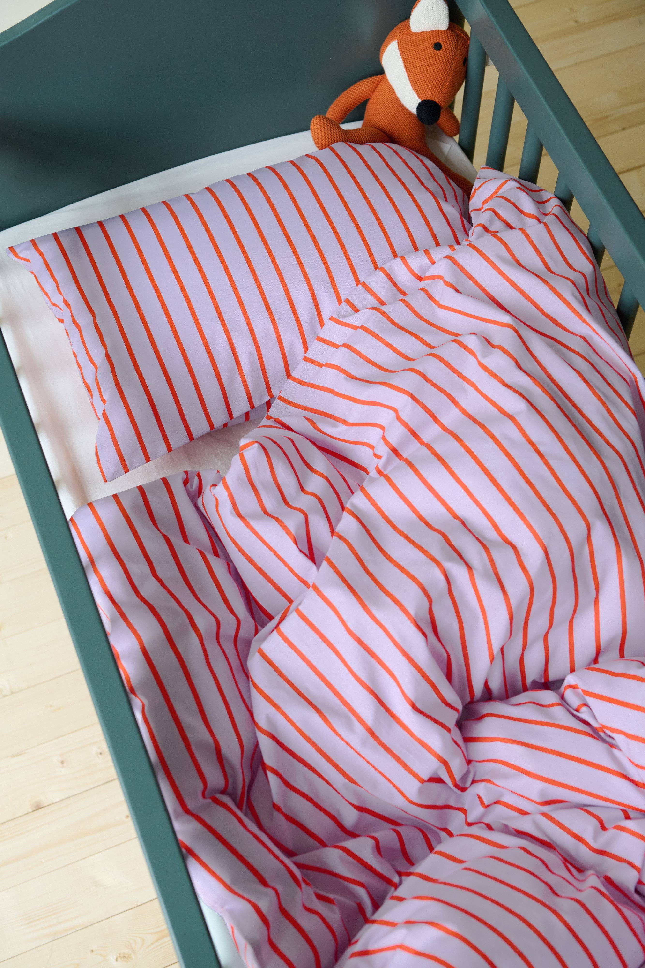 SIMA dynebetræk af økologisk bomuld, der er skræddersyet til at passe perfekt til din tremmeseng og giver et blødt touch til din lille søvns afslappede søvn. Trykte striber i sprøde farver.