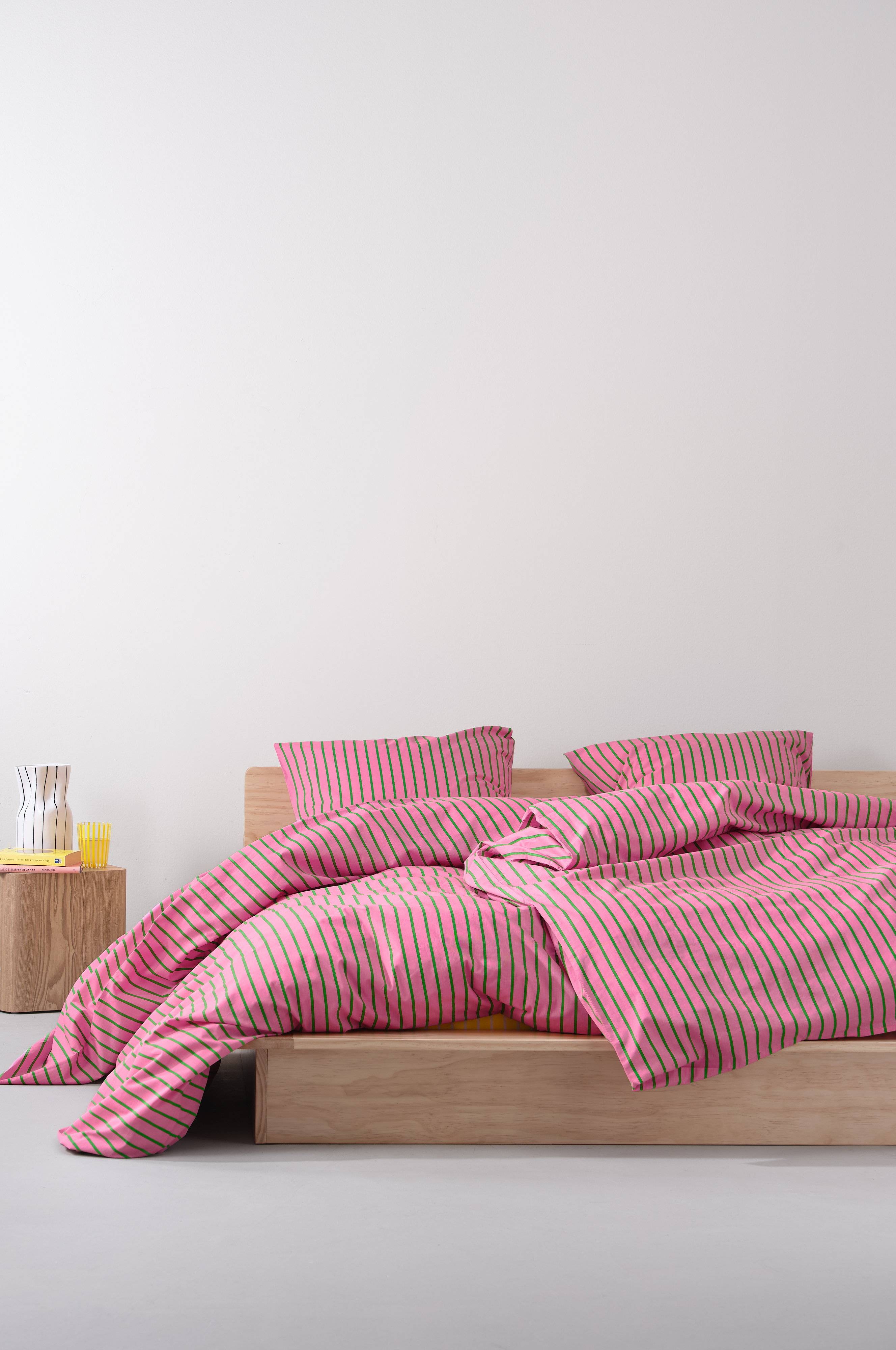 SIMA sengesæt af økologisk bomuld. Trykte striber i sprøde farver. Praktiske håndhuller til dynen gør det nemt. Forvandl dit soveværelse til et afslappende sted.
