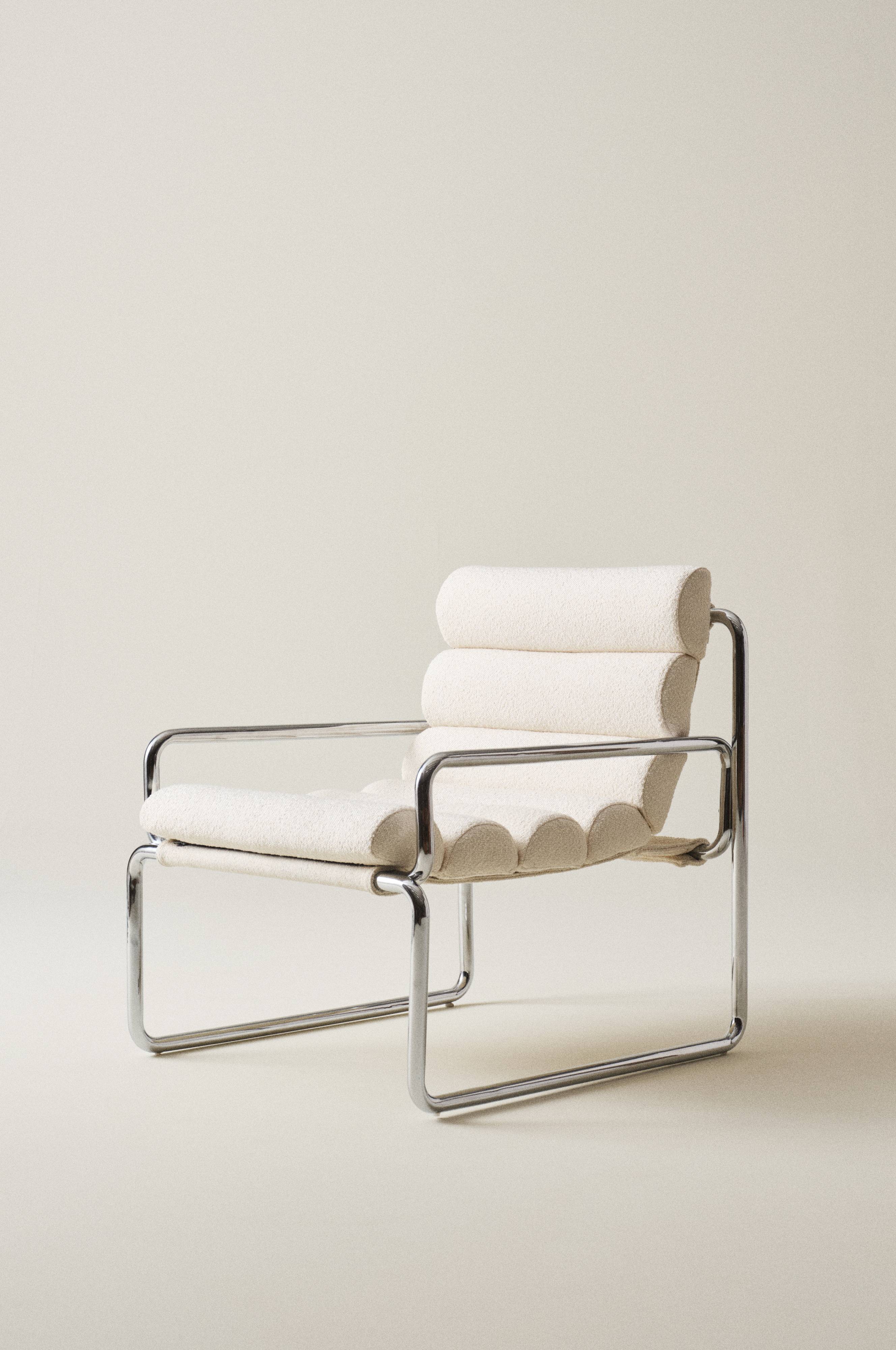 I SINES lænestolen kombinerer vi forkromede stålrør og et cylindrisk sæde i bedste 80'er stil. Resultatet er en behagelig og letplaceret lænestol, der giver rummet et luftigt og frisk udtryk. Det lyse stof er en blød bouclé lavet af genbrugsmateriale, og skumpolstringen giver komfort. Jernrørene er forkromede.