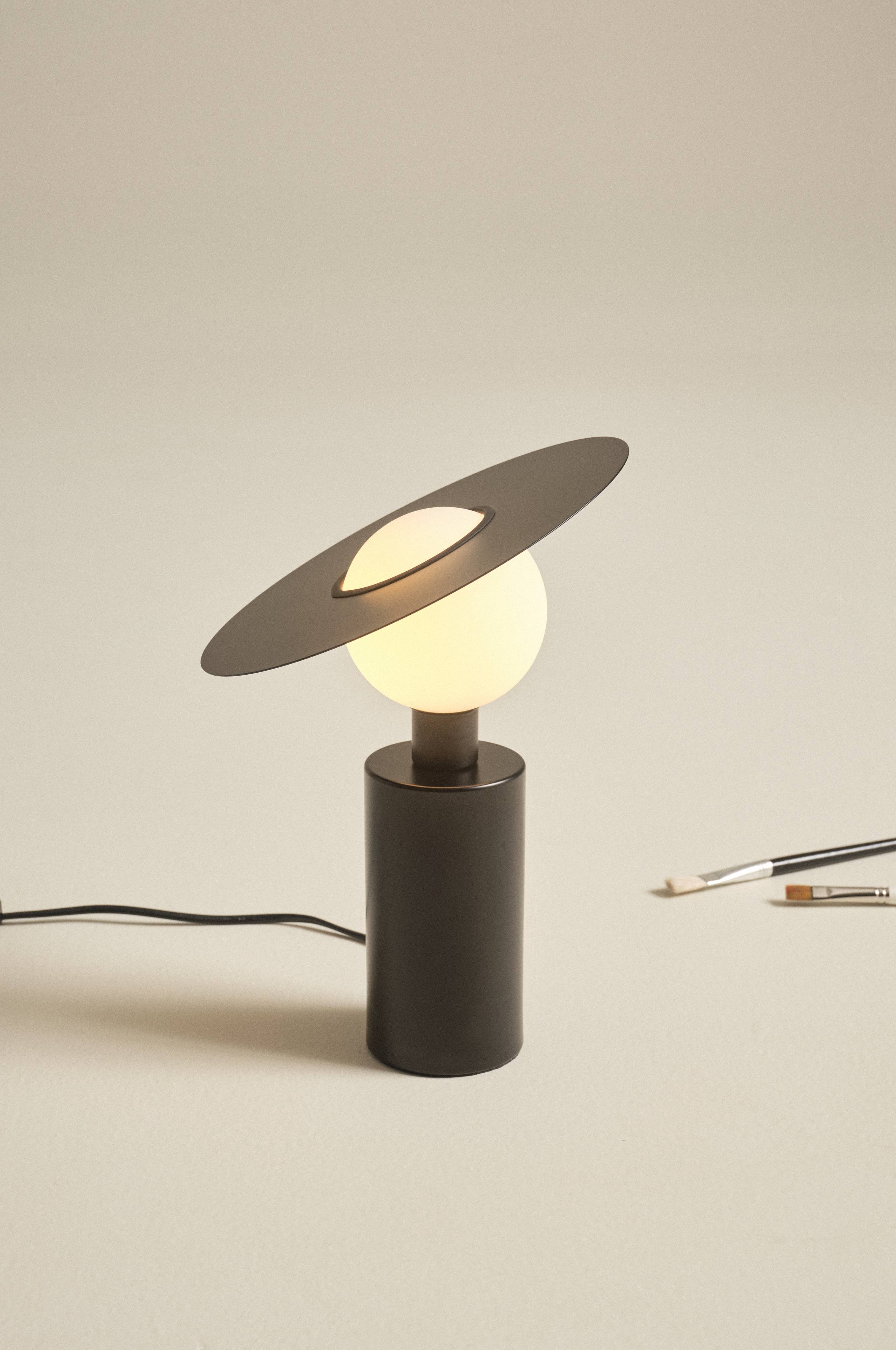 Spændende bordlampe af metal med rund kuppel af opalglas, en lampe som giver fleksibelt lys takket være skærmen på toppen. Skærmen kan placeres præcis som du vil på kuplen, så du kan skabe stemningsfuldt lys. Sort ledning med strømafbryder.