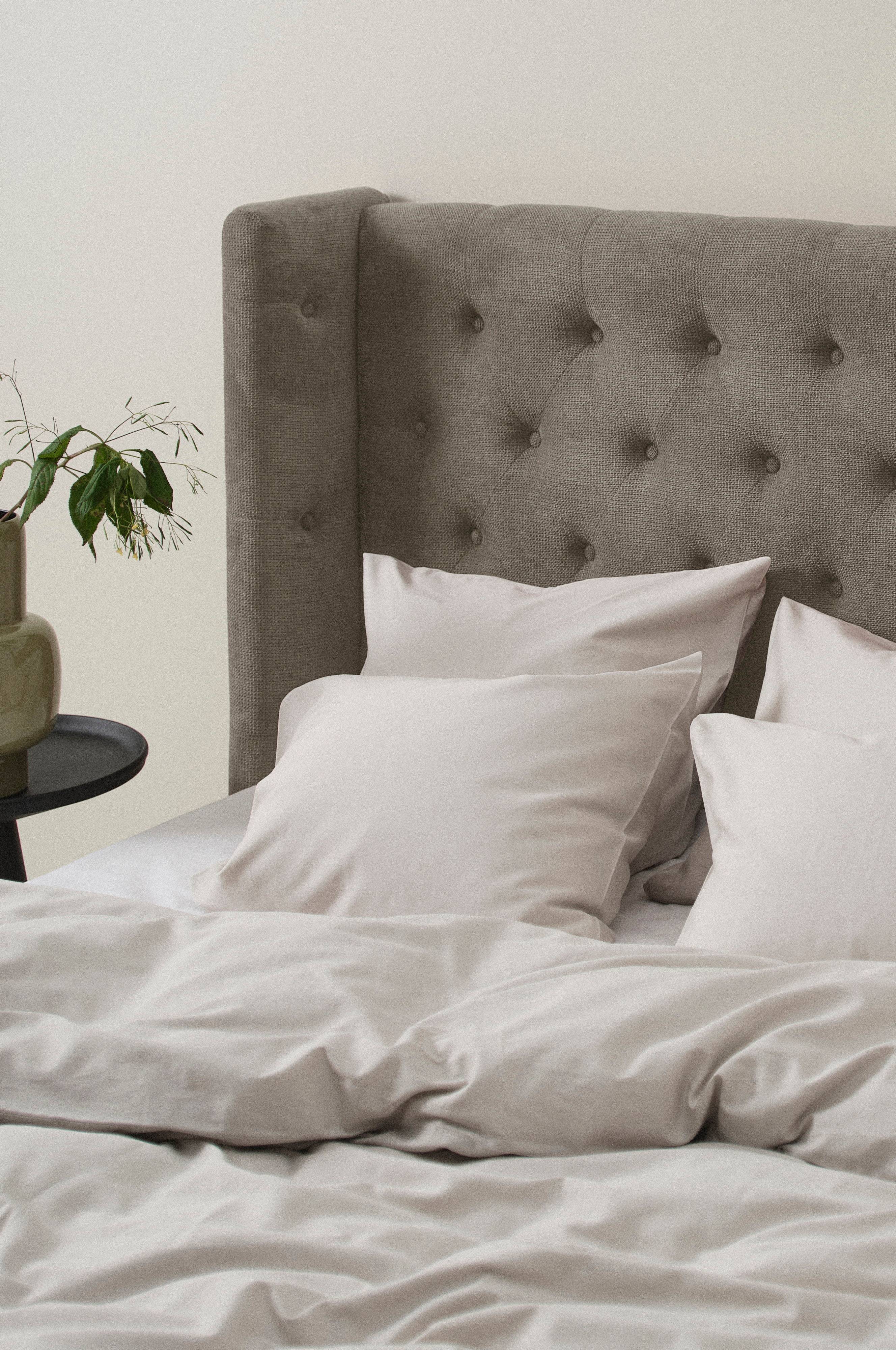 Fritstående sengegavl beklædt med et ensfarvet stof, der er blødt og behageligt. Sengegavlen har vinger i siderne, og de dybthæftede betrukne knapper giver et luksuriøst udtryk. Stellet er af plywood og massivt træ, som er polstret med skumgummifyld. Vægbeslag medfølger, en skinne på bagsiden gør det nemt at hænge gavlen op, hvis du ønsker det. Du kan også klemme sengegavlen fast mellem sengen og væggen. Nogen montering kræves. Samlevejledning medfølger.