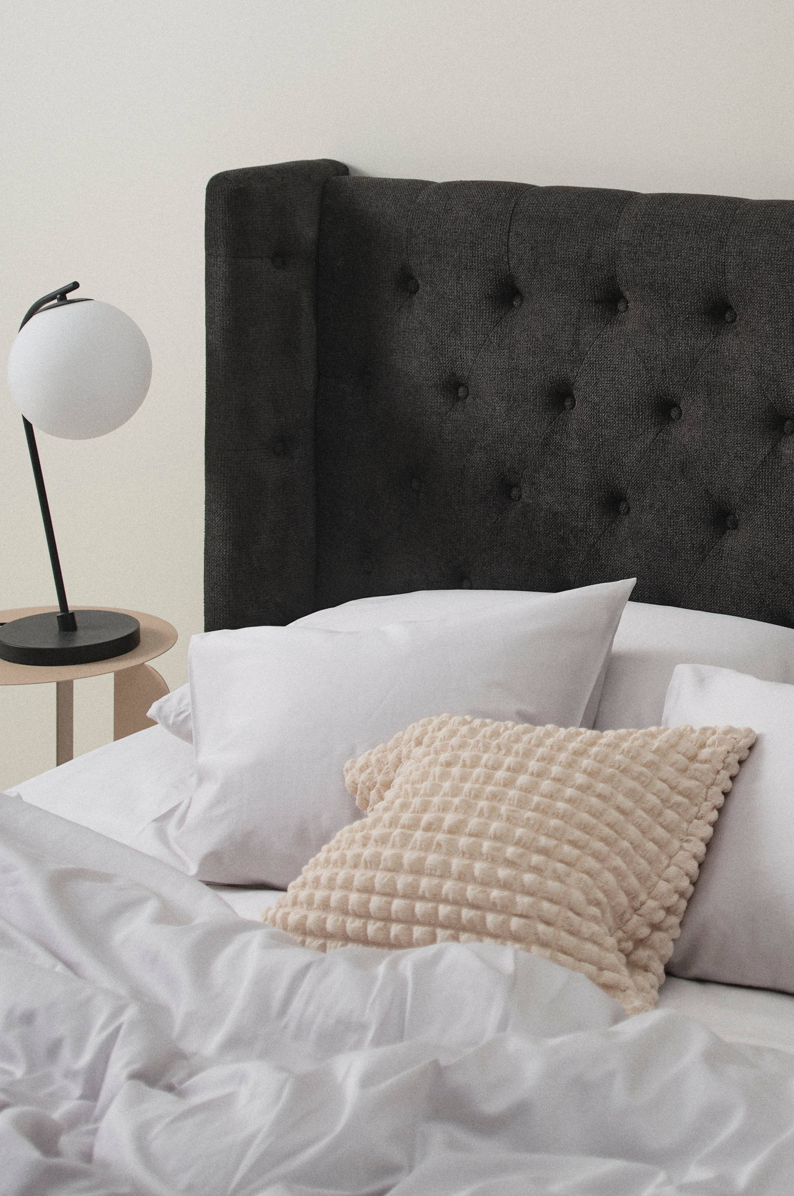 Fritstående sengegavl beklædt med et ensfarvet stof, der er blødt og behageligt. Sengegavlen har vinger i siderne, og de dybthæftede betrukne knapper giver et luksuriøst udtryk. Stellet er af plywood og massivt træ, som er polstret med skumgummifyld. Vægbeslag medfølger, en skinne på bagsiden gør det nemt at hænge gavlen op, hvis du ønsker det. Du kan også klemme sengegavlen fast mellem sengen og væggen. Nogen montering kræves. Samlevejledning medfølger.