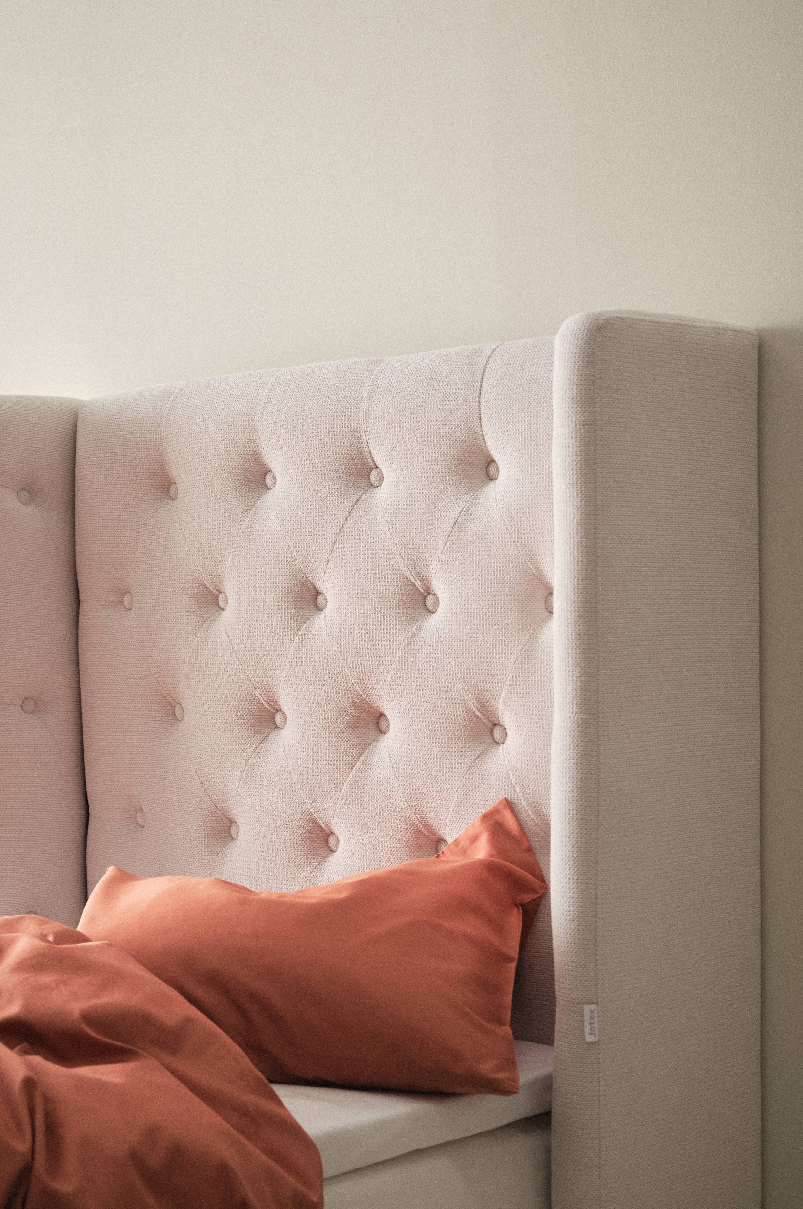 Fritstående sengegavl beklædt med et ensfarvet stof, der er blødt og behageligt. Sengegavlen har vinger i siderne, og de dybthæftede betrukne knapper giver et luksuriøst udtryk. Stellet er af plywood og massivt træ, som er polstret med skumgummifyld. Vægbeslag medfølger, en skinne på bagsiden gør det nemt at hænge gavlen op, hvis du ønsker det. Du kan også klemme sengegavlen fast mellem sengen og væggen. Nogen montering kræves. Samlevejledning medfølger.
