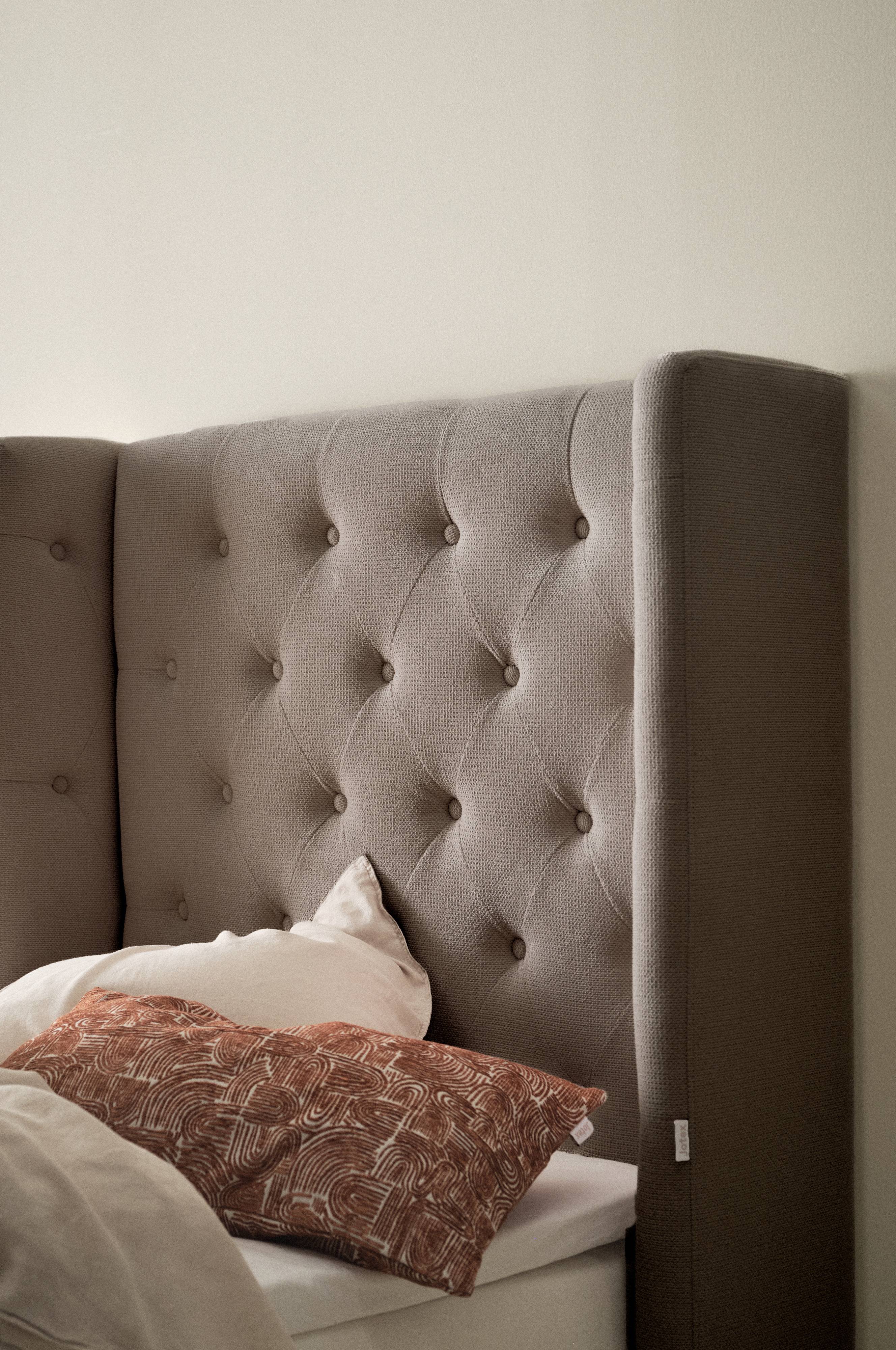 Fritstående sengegavl beklædt med et ensfarvet stof, der er blødt og behageligt. Sengegavlen har vinger i siderne, og de dybthæftede betrukne knapper giver et luksuriøst udtryk. Stellet er af plywood og massivt træ, som er polstret med skumgummifyld. Vægbeslag medfølger, en skinne på bagsiden gør det nemt at hænge gavlen op, hvis du ønsker det. Du kan også klemme sengegavlen fast mellem sengen og væggen. Nogen montering kræves. Samlevejledning medfølger.