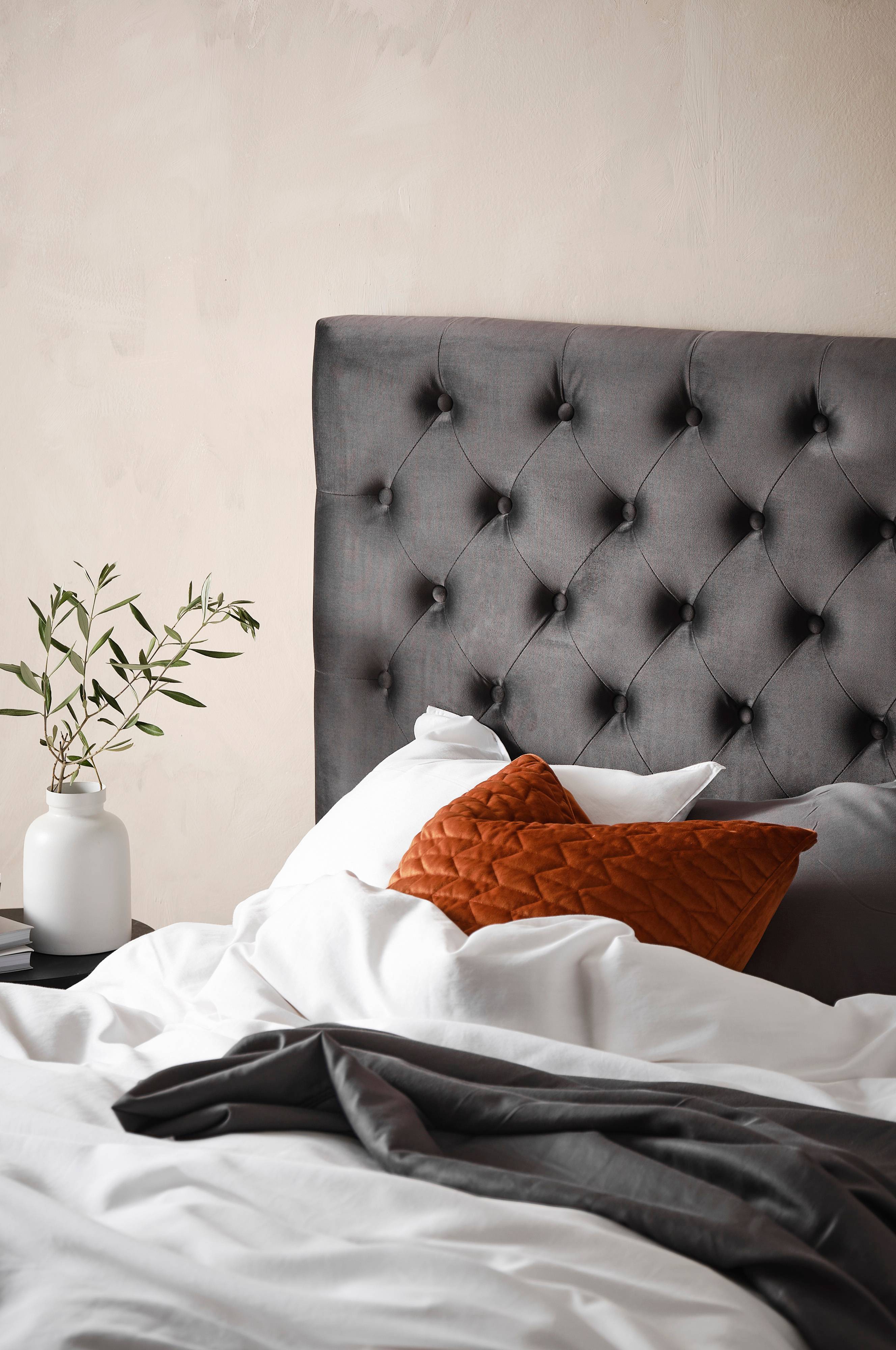 Skab en personlig stil og en luksuriøs følelse i soveværelset med en gedigen sengegavl i blød velour.