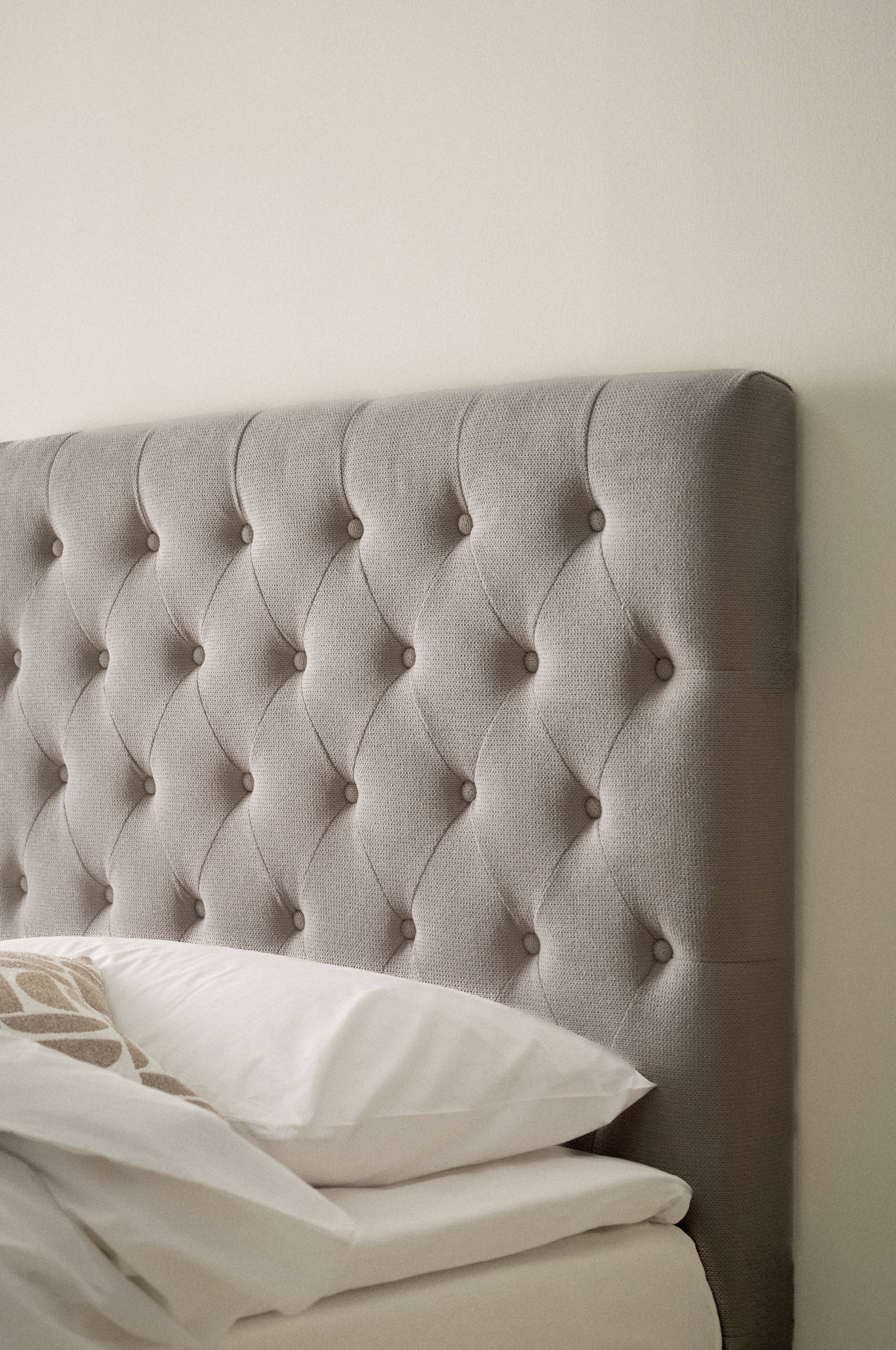 Fritstående sengegavl beklædt med et ensfarvet stof, der er blødt og behageligt. De dybthæftede betrukne knapper giver et luksuriøst udtryk. Stellet er af plywood og massivt træ, som er polstret med skumgummifyld. Vægbeslag medfølger, en skinne på bagsiden gør det nemt at hænge gavlen op, hvis du ønsker det. Du kan også klemme sengegavlen fast mellem sengen og væggen. Nogen montering kræves. Samlevejledning medfølger.
