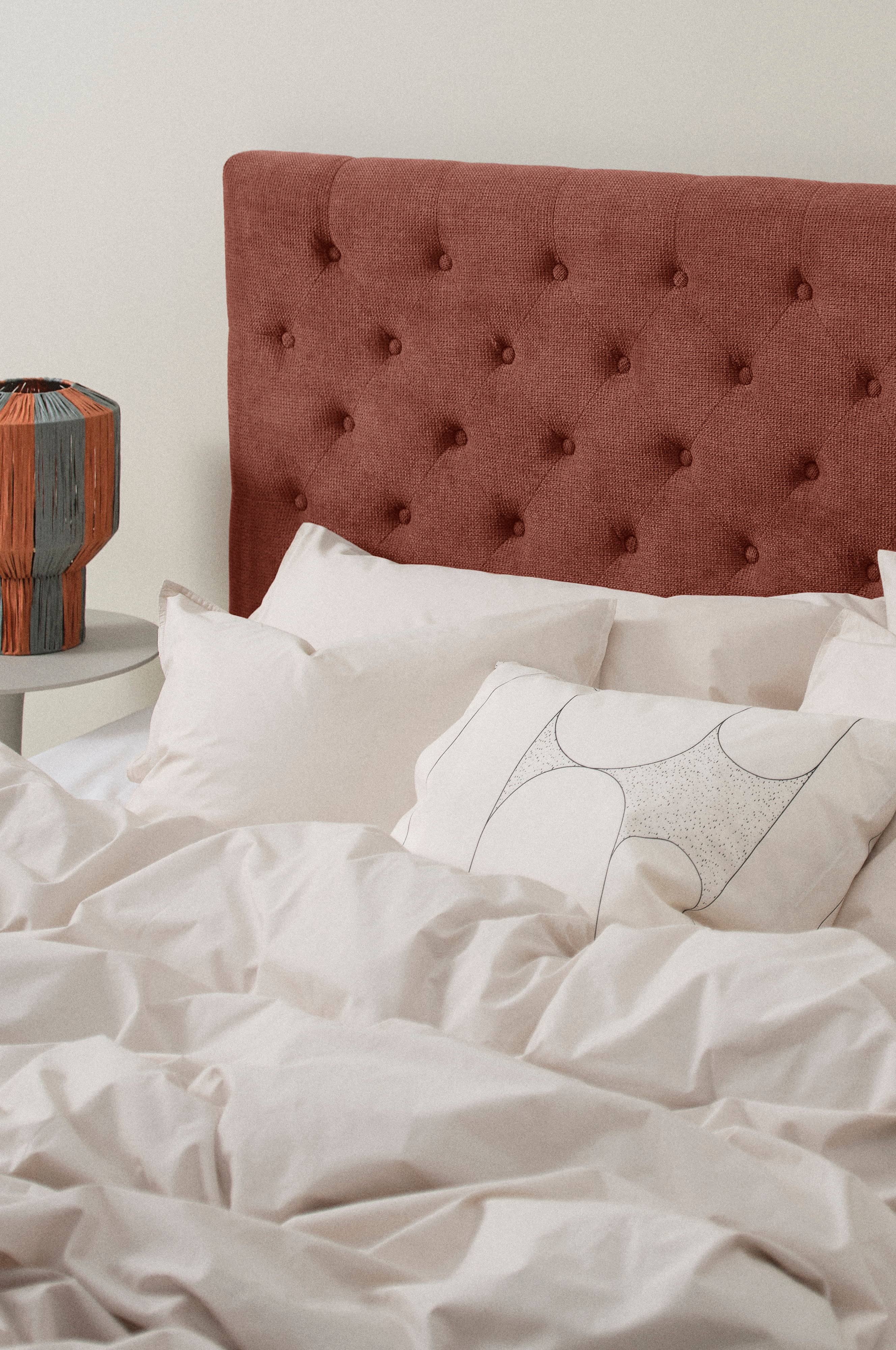 Fritstående sengegavl beklædt med et ensfarvet stof, der er blødt og behageligt. De dybthæftede betrukne knapper giver et luksuriøst udtryk. Stellet er af plywood og massivt træ, som er polstret med skumgummifyld. Vægbeslag medfølger, en skinne på bagsiden gør det nemt at hænge gavlen op, hvis du ønsker det. Du kan også klemme sengegavlen fast mellem sengen og væggen. Nogen montering kræves. Samlevejledning medfølger.