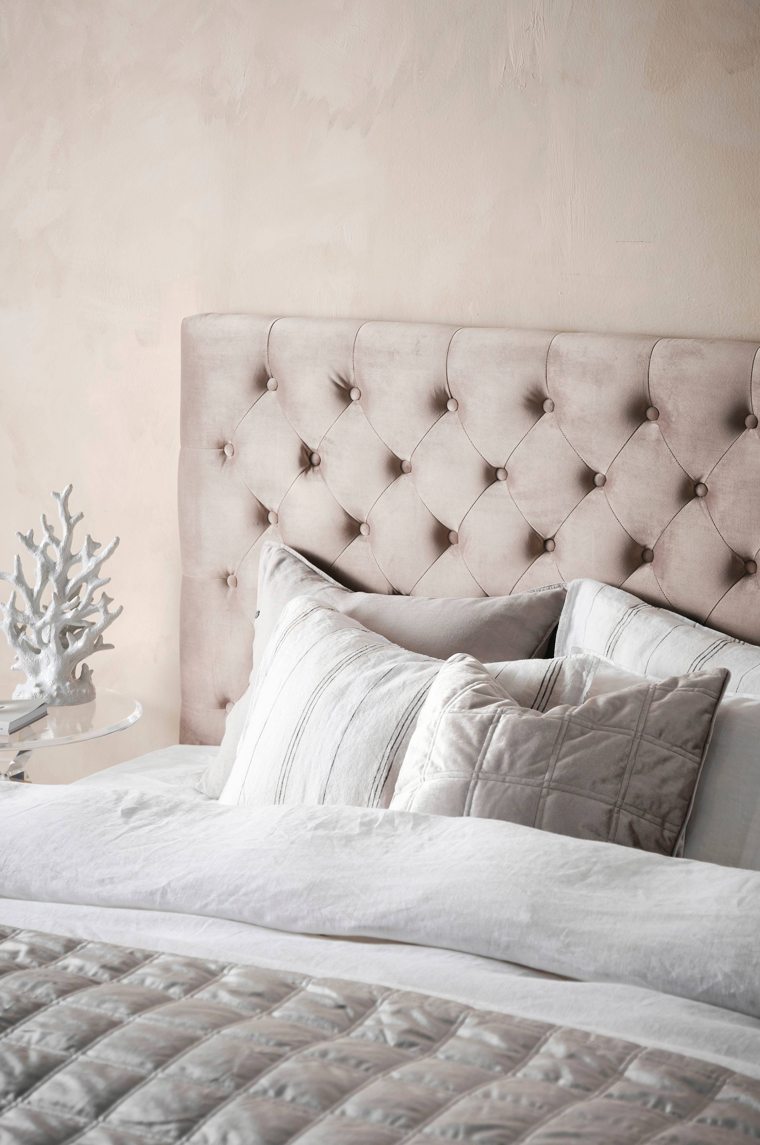 Skab en personlig stil og en luksuriøs følelse i soveværelset med en gedigen sengegavl i blød velour.