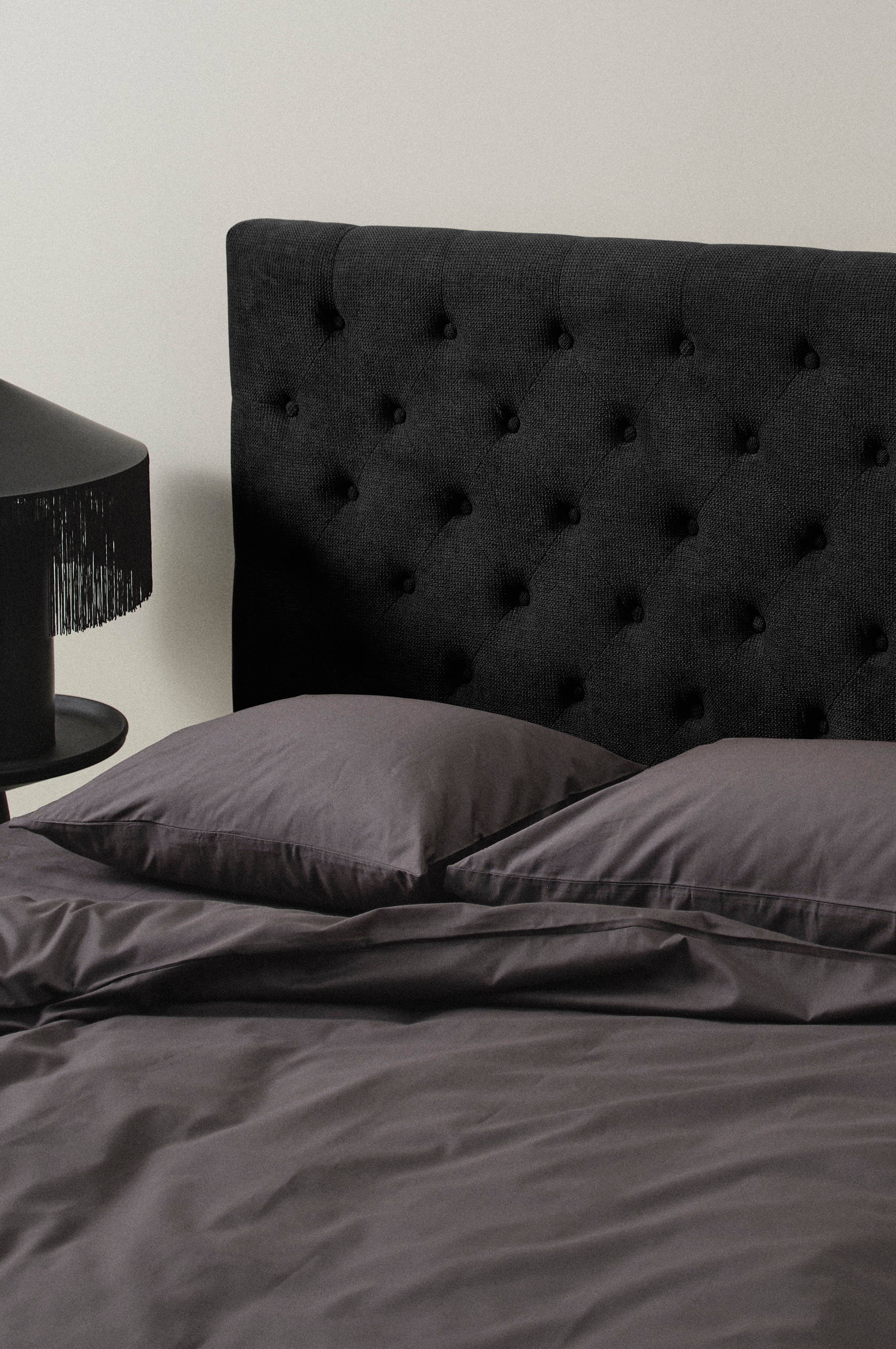 Fritstående sengegavl beklædt med et ensfarvet stof, der er blødt og behageligt. De dybthæftede betrukne knapper giver et luksuriøst udtryk. Stellet er af plywood og massivt træ, som er polstret med skumgummifyld. Vægbeslag medfølger, en skinne på bagsiden gør det nemt at hænge gavlen op, hvis du ønsker det. Du kan også klemme sengegavlen fast mellem sengen og væggen. Nogen montering kræves. Samlevejledning medfølger.