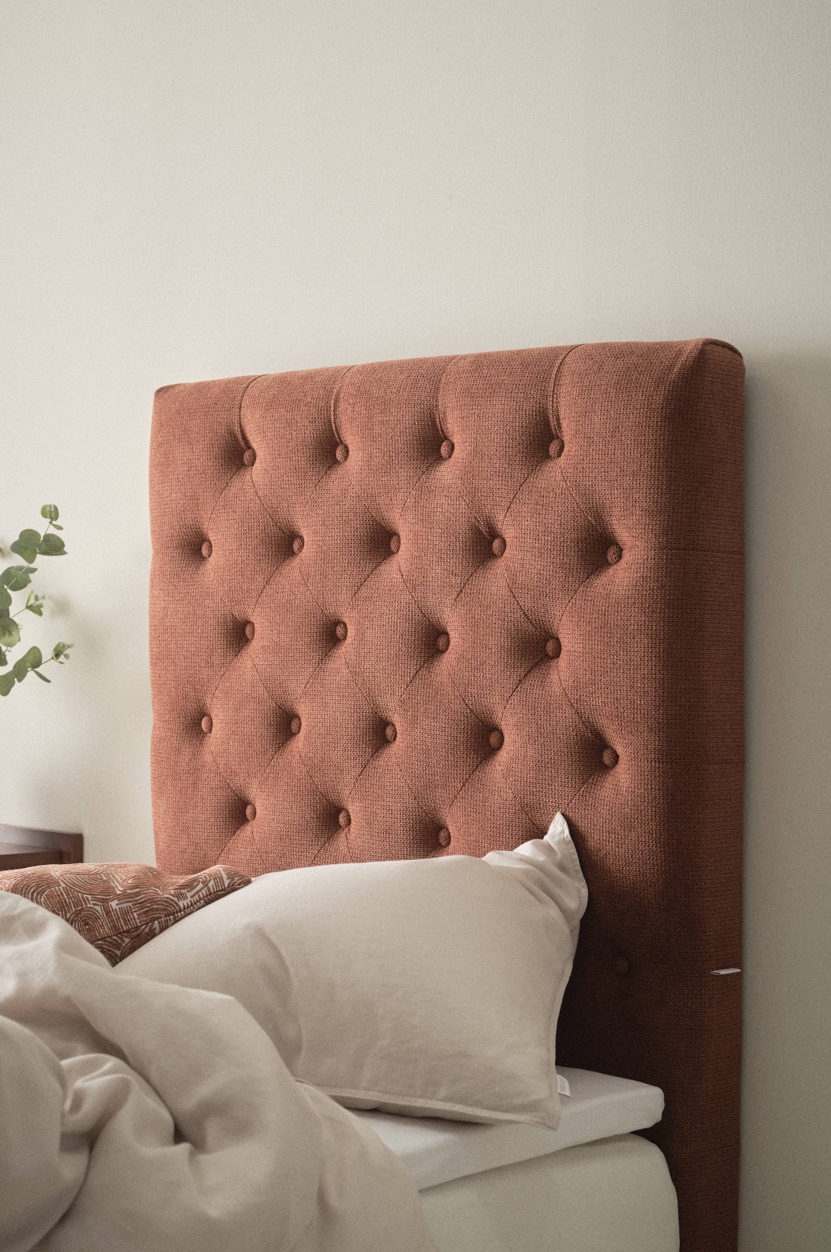 Fritstående sengegavl beklædt med et ensfarvet stof, der er blødt og behageligt. De dybthæftede betrukne knapper giver et luksuriøst udtryk. Stellet er af plywood og massivt træ, som er polstret med skumgummifyld. Vægbeslag medfølger, en skinne på bagsiden gør det nemt at hænge gavlen op, hvis du ønsker det. Du kan også klemme sengegavlen fast mellem sengen og væggen. Nogen montering kræves. Samlevejledning medfølger.