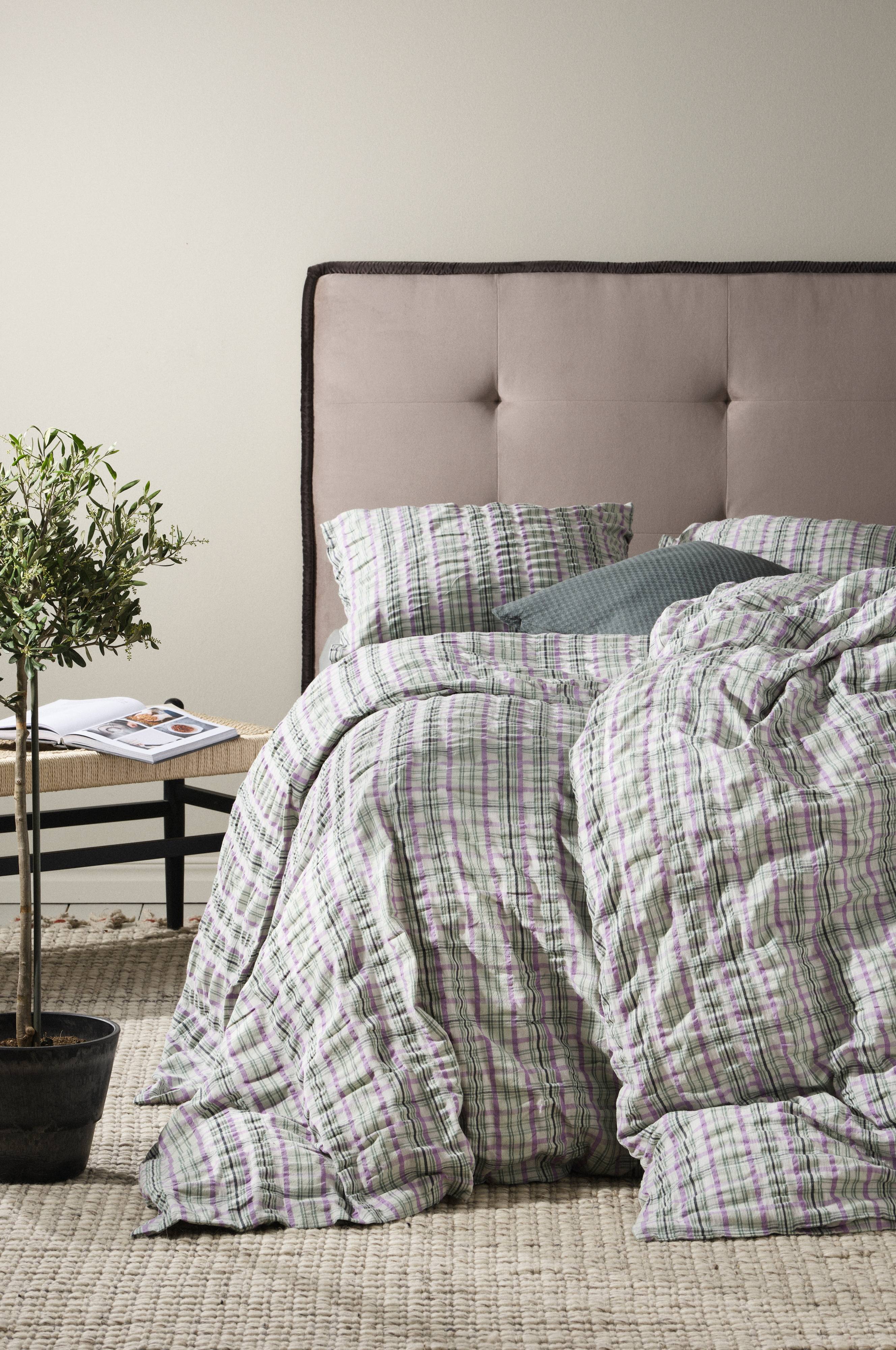 Tip/råd: Den friske SKYE-serie fås i flere dele, så du kan rede sengen ensartet med ternet bæk-og-bølge.